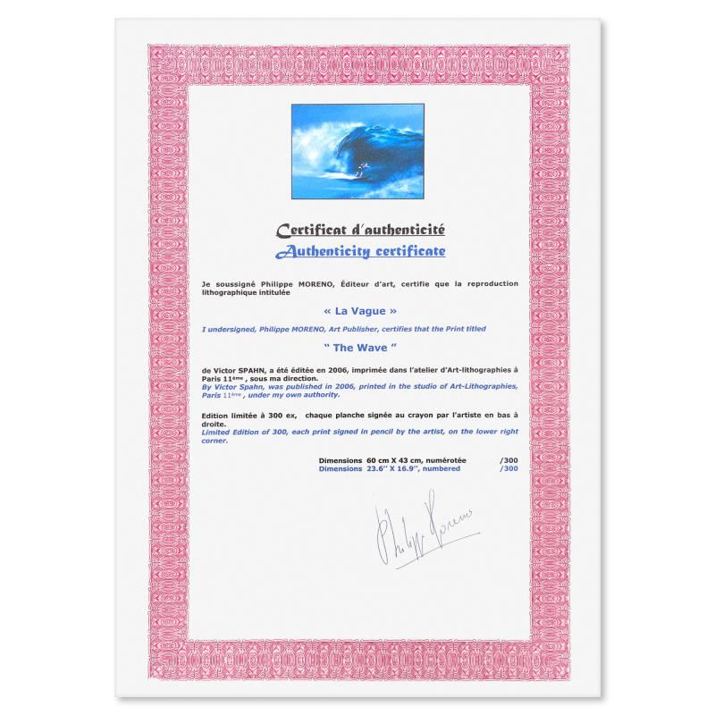 The Wave is a limited edition lithograph on paper by Victor Spahn. Printed at Art-Lithographies workshop in Paris, the piece is hand signed by the artist and comes with a certificate of authenticity. Measures approximately 17 x 23.5 (image).