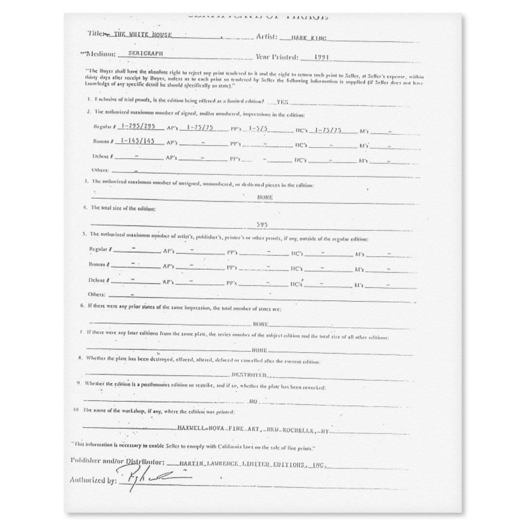 "The White House" is a limited edition serigraph on paper by Mark King (1931-2014). Hand signed and numbered, this piece comes with a letter of authenticity and measures approximately 28" x 36" (image).