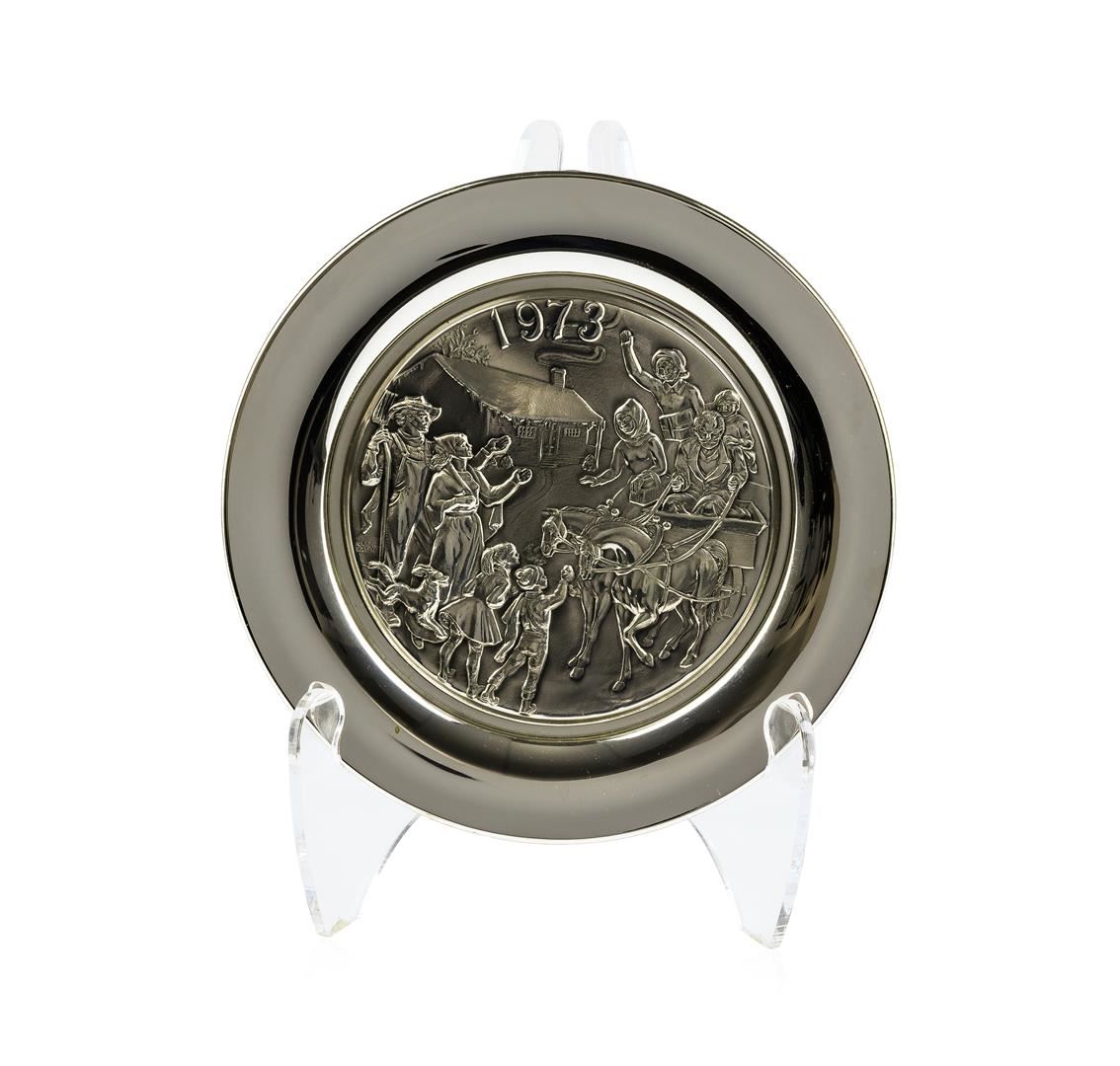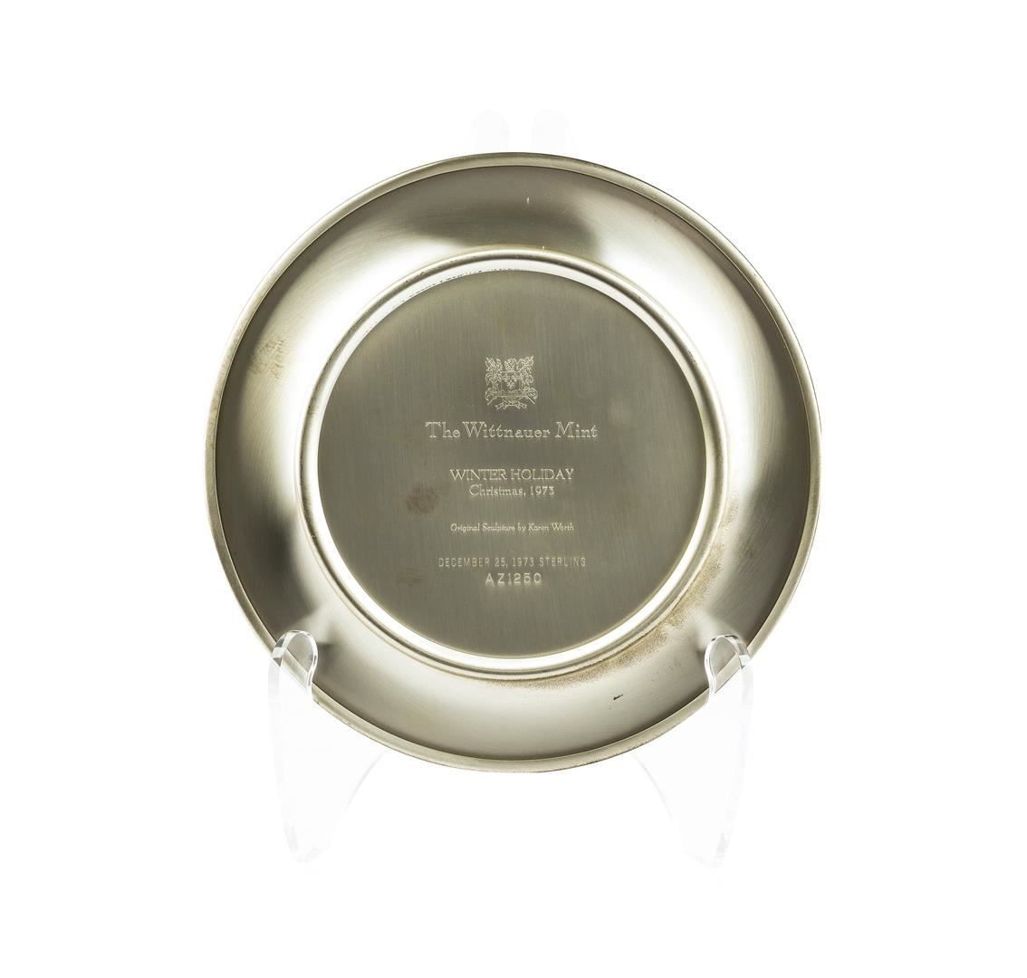 The Wittnauer Mint Sterling Silver "Winter Holiday" Christmas 1973 plate measures 8" around. Weighs 311g.