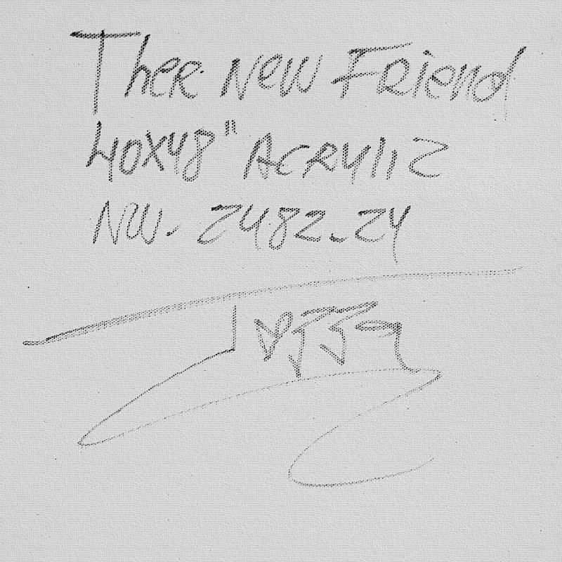 "Ther New Friend" is a unique mixed media acrylic on gallery wrapped canvas by Jozza. Hand Signed by the artist and titled in verso, the piece comes with a letter of authenticity. Measures approximately 48" x 40" (image).