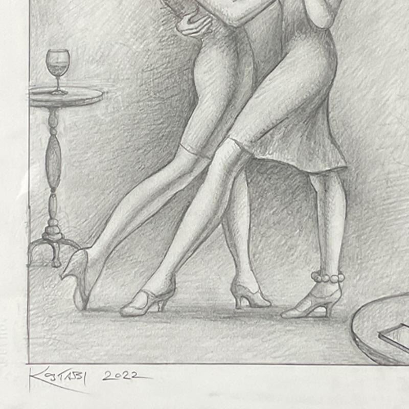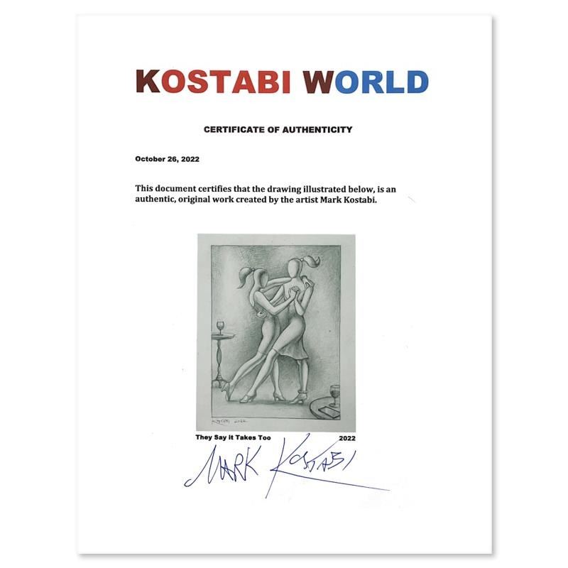 "They Say it Takes Two" is an original drawing on paper by Mark Kostabi, dated 2022 and hand signed by the artist. This piece comes custom framed. Includes Certificate of Authenticity. Measures approx. 16" x 18.5" (frame), 8" x 11" (image).