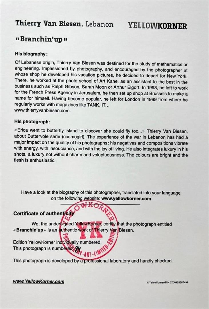 Thierry Van Biesen Branchin Up Cosmogirl Buttervole series YellowKorner Certified Photograph. Certificate of Authenticity from YellowKorner affixed to the back. Matted Dimensions 16"x20". Protected with Clear Mylar Sleeve.