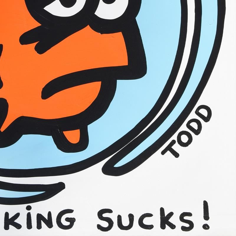 We acquired this piece as part of a larger collection. We do not approve of its inappropriate content. "This Sucks" is an original acrylic painting on canvas by Todd Goldman, hand signed by the artist. Includes Letter of Authenticity. Measures approx. 48" x 48" (image). Due to the way this piece was stored there may be minor wear or signs of age (such as wear on the corners) but the piece is in overall good condition.