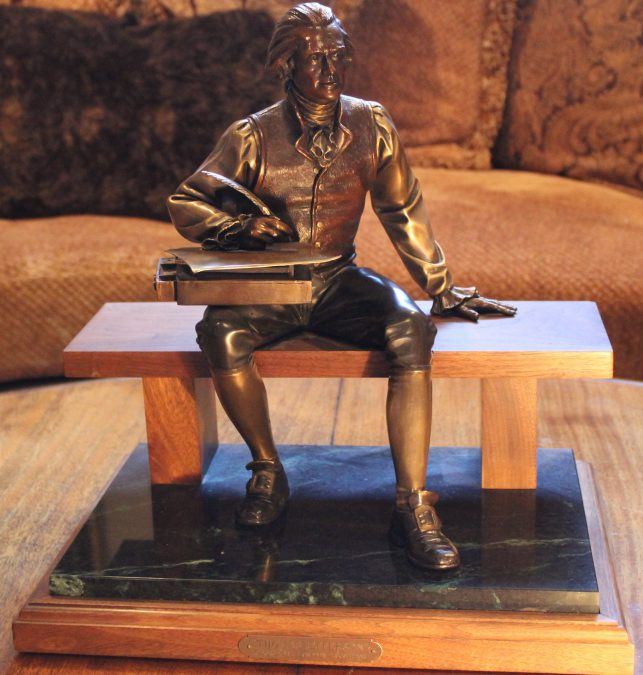 Thomas Jefferson by George Lundeen is a limited edition bronze sculpture of Thomas Jefferson writing. The size is 15-1/2"high x 15" wide x 11".