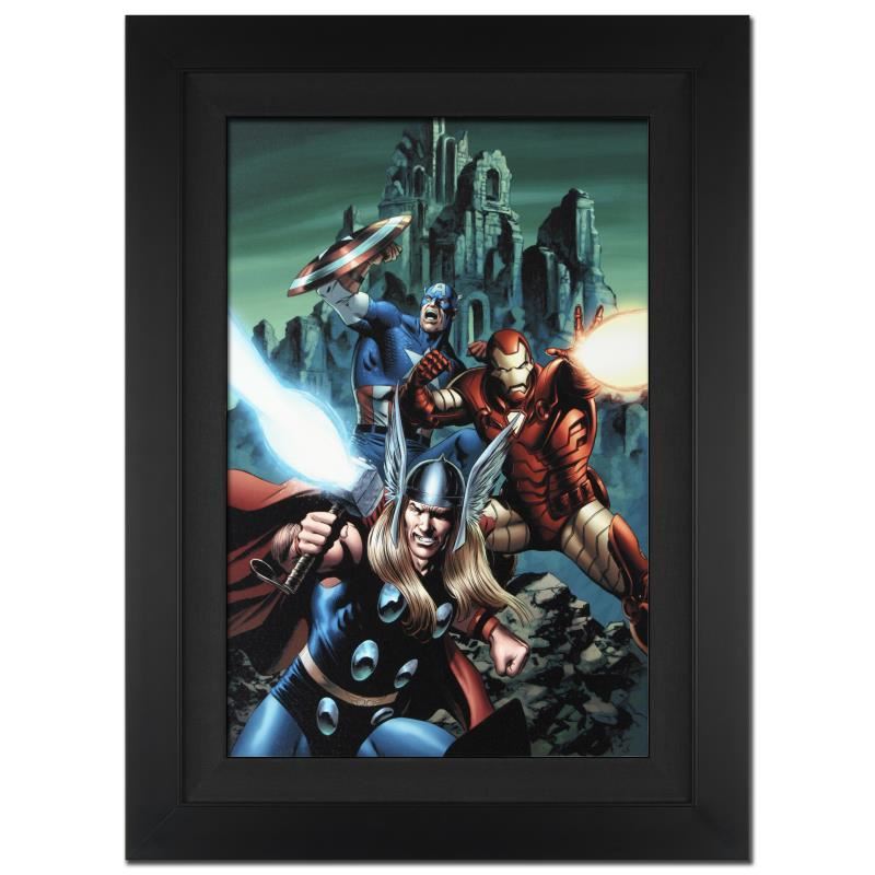 A piece of comic book history, this limited edition, from original art by Steve Epting, depicts the heroic Thor, Iron Man, and Captain America. Steve Epting began working with Marvel Comics in the early 1990s; his first assignment was a six part Avengers series, thereafter he became a full time penciler on the Avengers. More recently Epting has been working on the Fantastic Four as well as Captain America. "Thor #81" is an extremely limited edition giclee on canvas by Steve Epting presented by Marvel Comics, hand signed by the great Stan Lee and numbered out of only 10! This piece is custom framed and ready to hang. Includes Certificate of Authenticity! Measure approx. 25" x 34" (with frame), 18" x 27" (image).