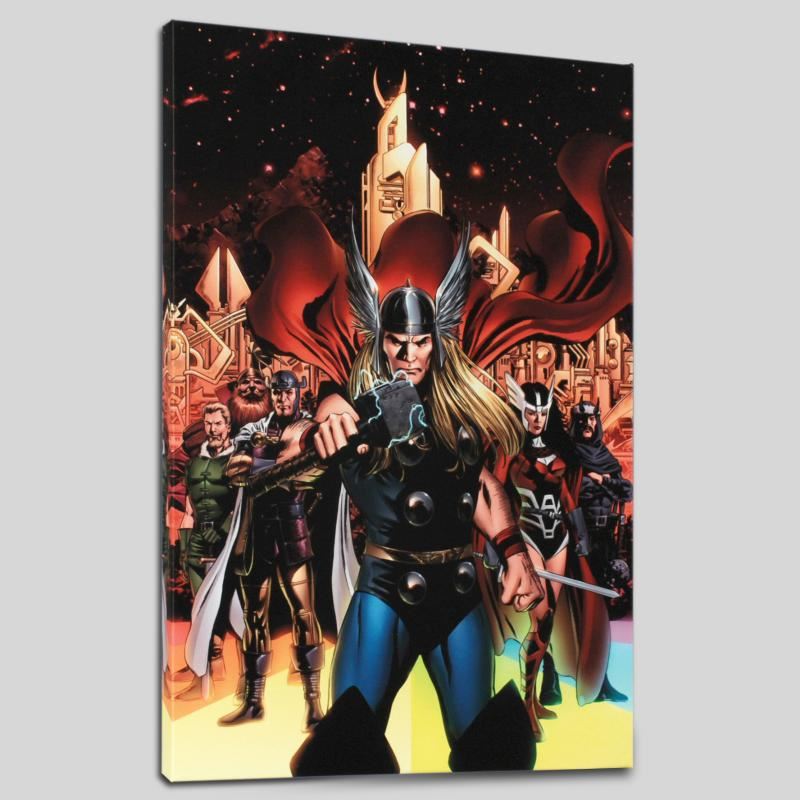 A piece of comic book history, this limited edition, from original art by Steve Epting, depicts a heroic Thor. Steve Epting began working with Marvel Comics in the early 1990s; his first assignment was a six part Avengers series, thereafter he became a full time penciler on the Avengers. More recently Epting has been working on the Fantastic Four as well as Captain America. "Thor #82" is a limited edition giclee on canvas by Steve Epting presented by Marvel Comics! This piece comes gallery wrapped. Includes Certificate of Authenticity! Measures approx. 18" x 27" (image); 1.5" (depth).