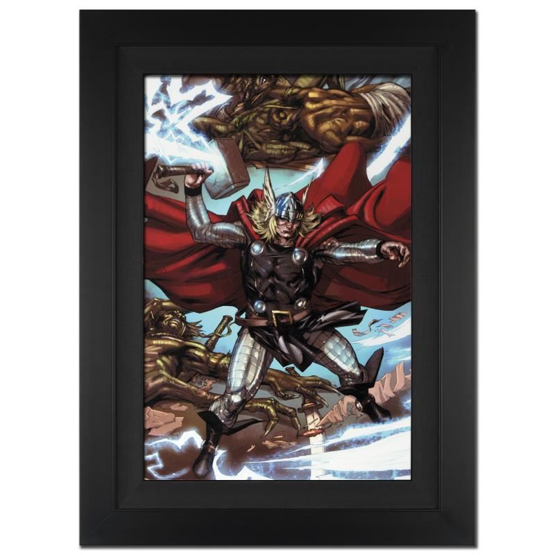A piece of comic book history, this limited edition, from original art by Tan Eng Huat, depicts Thor in a blaze of glory. Named 'Best New Talent' in the National Comics Awards (NCA) 2002, Tan Eng Huat has been a featured artist for different comic companies such as Marvel. He is most recognized for his work on the Punisher, Ghost Rider, Annihilators, and Deadpool comics. "Thor First Thunder #1" is an extremely limited edition giclee on canvas by Tan Eng Huat presented by Marvel Comics, hand signed by the great Stan Lee and numbered out of only 4! Includes Certificate of Authenticity! Measures approx. 29" x 40" (with frame); 22" x 33" (image).