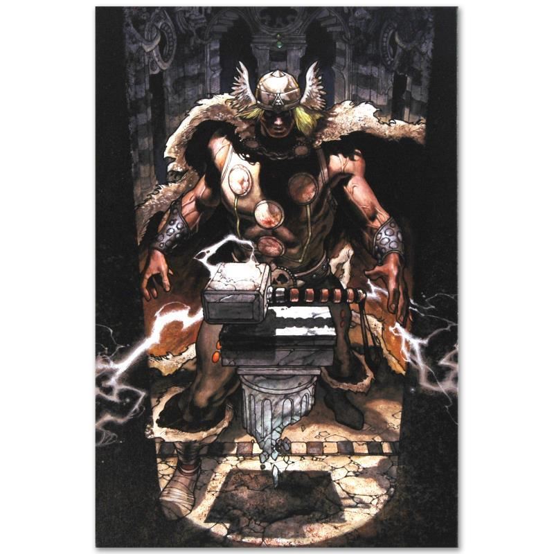A piece of comic book history this limited edition from original art by Simone Bianchi depicts a mighty Thor. Known for his use of ink wash in his work Simone Bianchi is an Italian comic book artist famous for his X-Men Unlimited artwork. "Thor: For Asgard #6" is a limited edition giclee on canvas by Simone Bianchi presented by Marvel Comics. This piece comes gallery wrapped. Includes Certificate of Authenticity! Measures approx. 18" x 27" (image); approx. 1.5" (depth). This item requires special handling and may have a longer than usual turnaround.