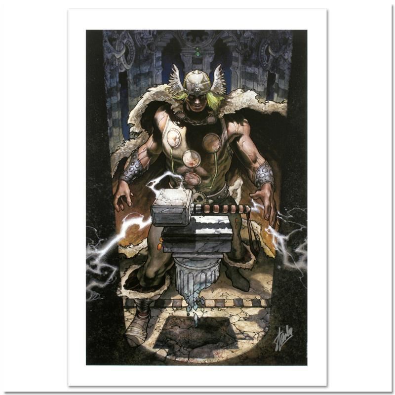 "Thor: For Asgard #6" is a limited edition giclee on canvas with art by Simone Bianchi. Officially licensed by Marvel, this piece is numbered 5/10 and hand signed by creative legend Stan Lee (1922-2018). The piece comes with a certificate of authenticity. Measures approximately 27" x 18".