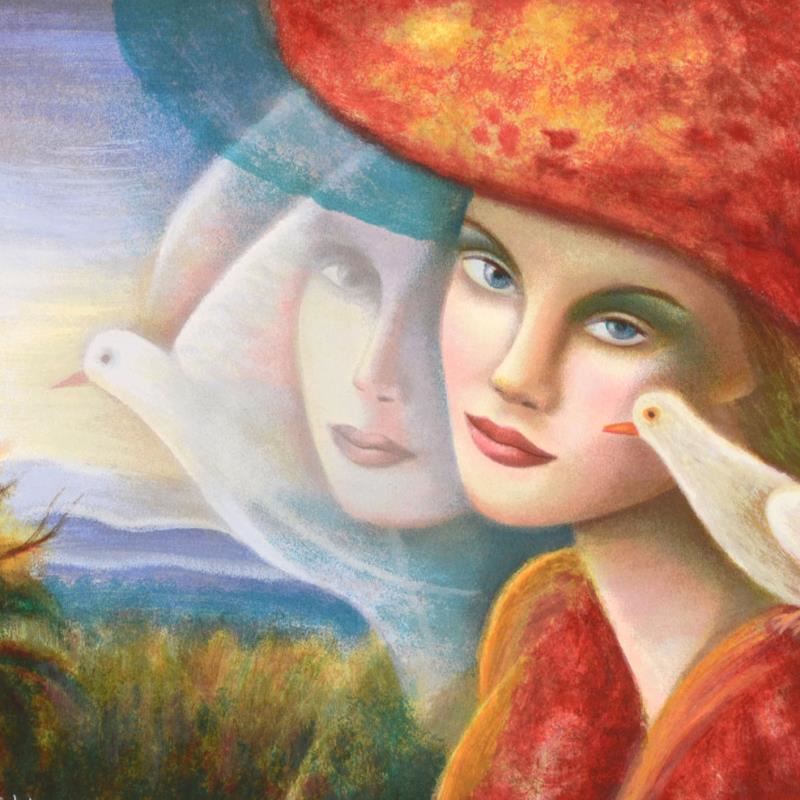 "Thought" is a limited edition serigraph on paper, numbered and hand signed by Rina Sutzkever. Includes Certificate of Authenticity. Measures approx. 19" x 14" (with border); 18.5" x 13.5" (image).