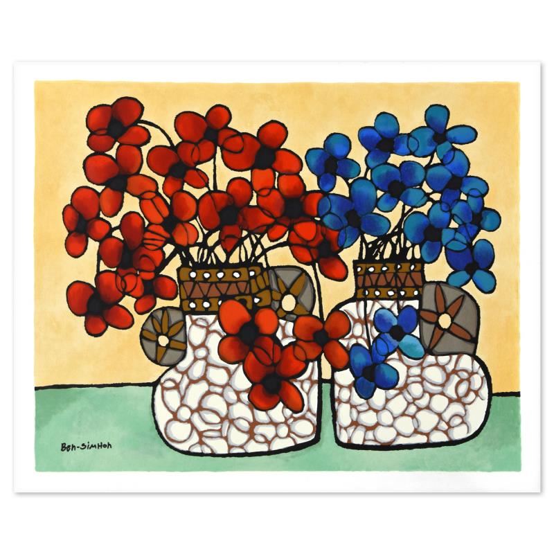 "Thoughts For Two" is a limited edition serigraph on paper by Ben Simhon, numbered and hand signed by the artist. Includes a Letter of Authenticity. Measures approx. 29" x 23" (border), 27" x 21" (image).