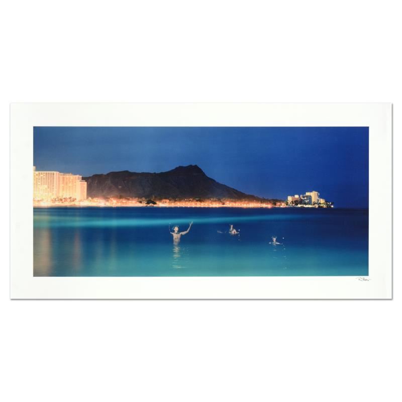 "Three Hawaiian Spirits in Waikiki" is a limited edition on paper, numbered and hand signed by photographer, Robert Sheer. Sheer created this piece using his "Spirit Shadows" technique which involves using a single-exposure ranging from minutes to hours in which he walks into the shot creating figures on film; no photoshop or digital manipulation is involved. Includes Certificate of Authenticity. Measures approx. 32" x 16" (border), 28" x 12.5" (image).