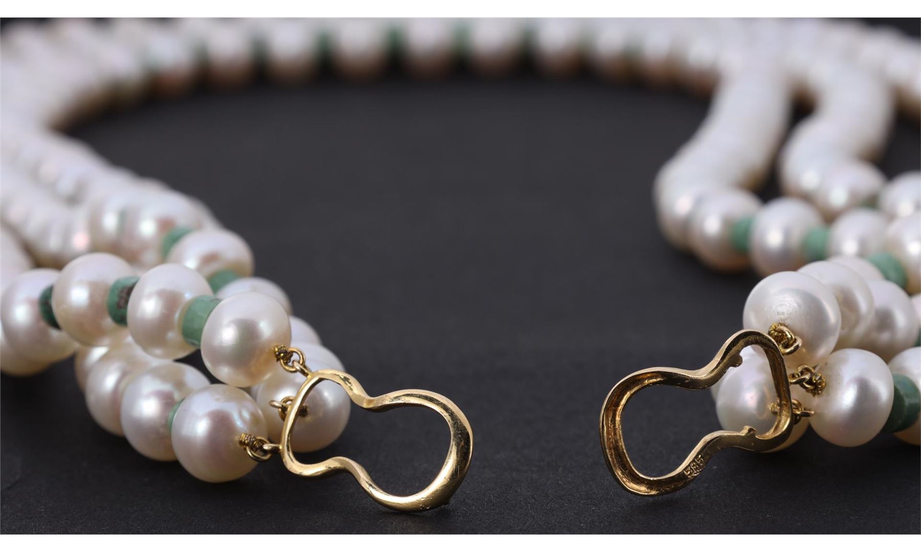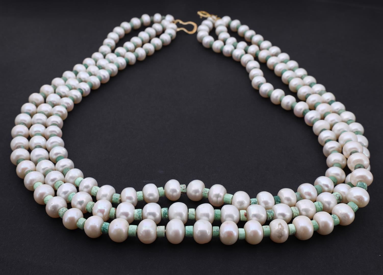 A three-strand natural pearl necklace spaced with antique Peruvian roundels and a 14k yellow gold marked open-form clasp; gross weight 192.9 g, L 23" (approx.)