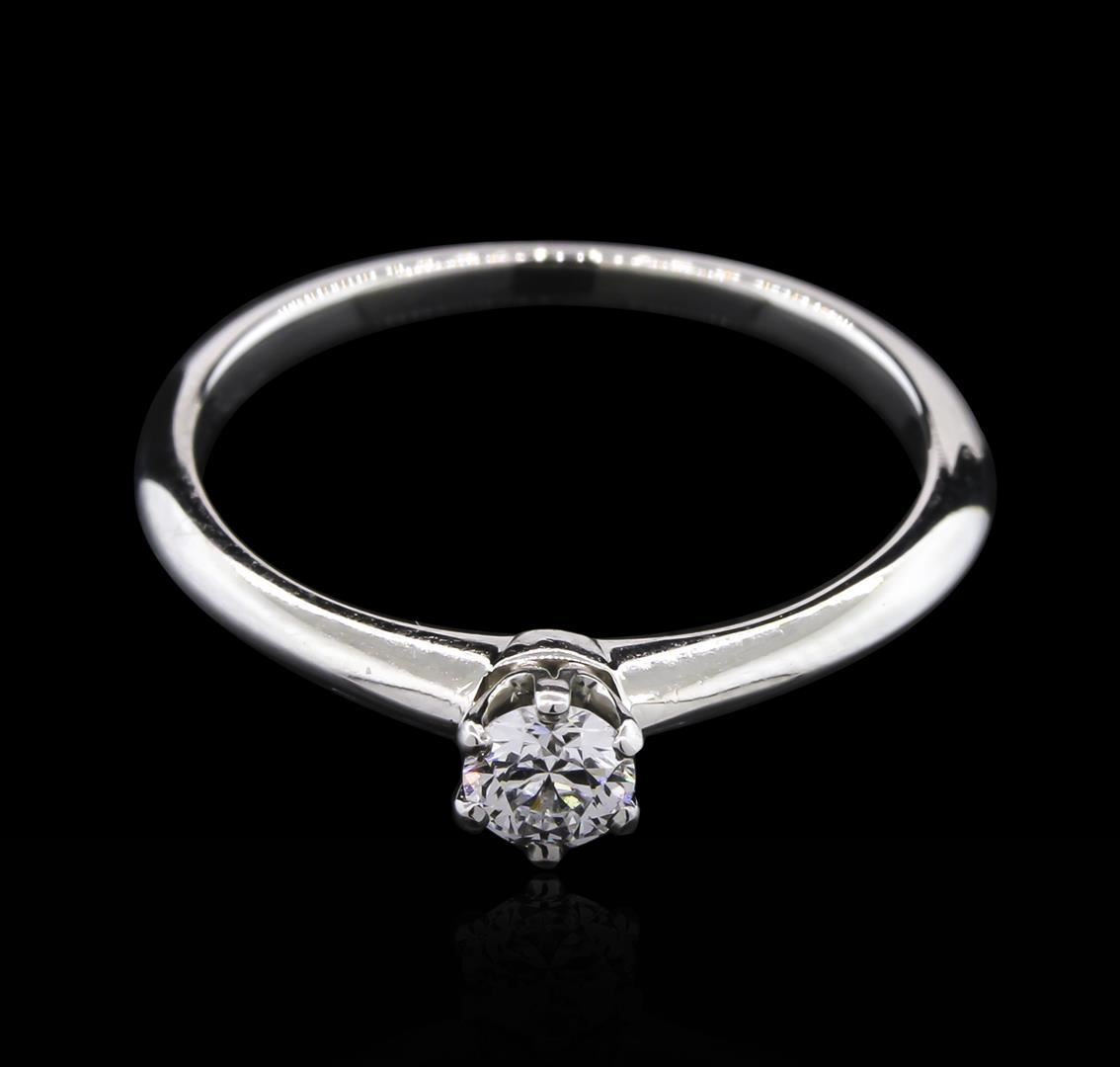 One platinum Tiffany & Co. diamond solitaire ring. Diamond Info - Shape: Round. Diamond size: 0.19ct. Clarity: VS-2. Color: I. The total weight of the ring is 2.70 grams. Comes with Tiffany & Co. inner and outer box.