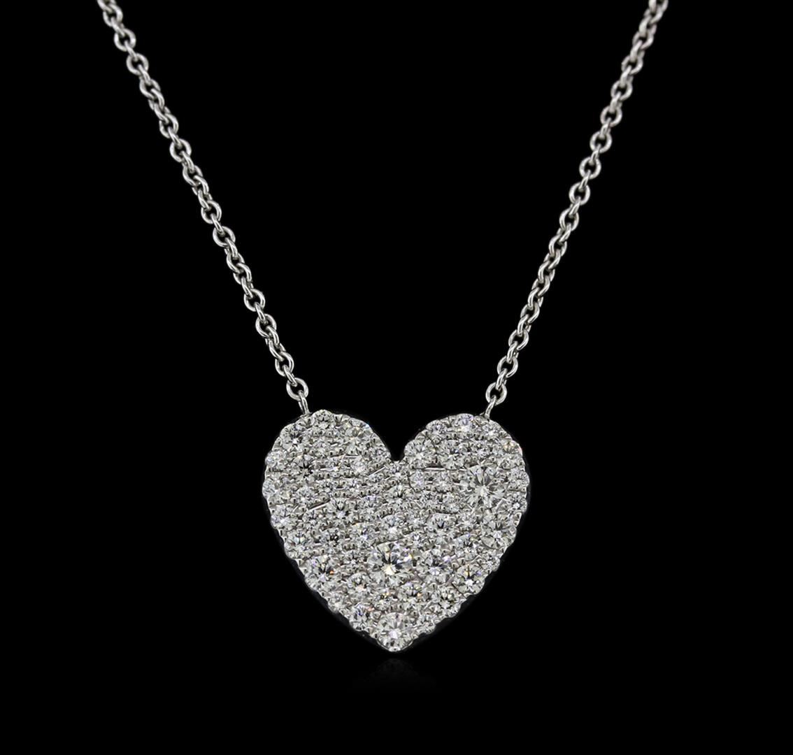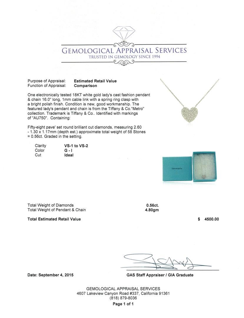 One electronically tested 18KT white gold lady's cast fashion pendant & chain 16.0" long, 1mm cable link with a spring ring clasp with a bright polish finish. The featured lady's pendant and chain is from the Tiffany & Co. "Metro" collection. Trademark is Tiffany & Co. Identified with markings of "AU750". Condition is new, good workmanship. Containing: Fifty-Eight pave' set round brilliant cut diamonds, measuring 2.60 - 1.30 x 1.17mm (depth est.) approximate total weight of 58 Stones = 0.56ct. Graded in the setting. Clarity: VS-1 to VS-2. Color: G - I. Cut Ideal. Total Weight of Diamonds 0.56ct. Total Weight of Pendant & Chain 4.80gm. GAS Appraised at $4,500.00.