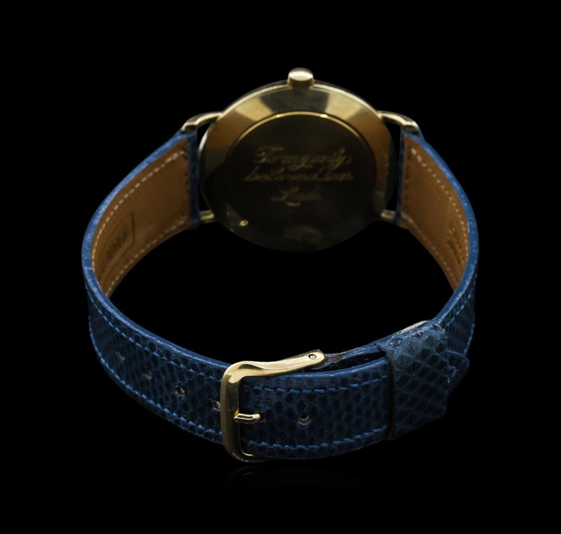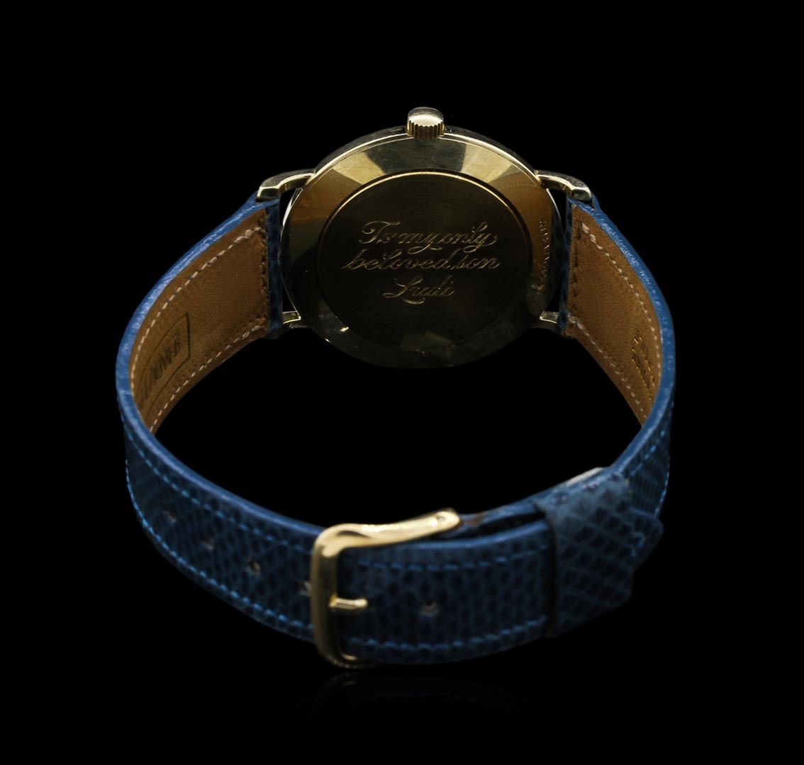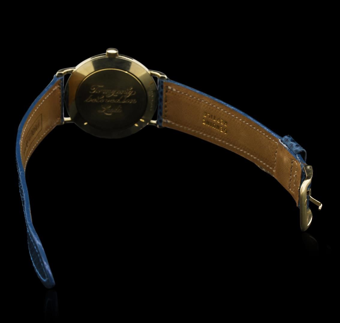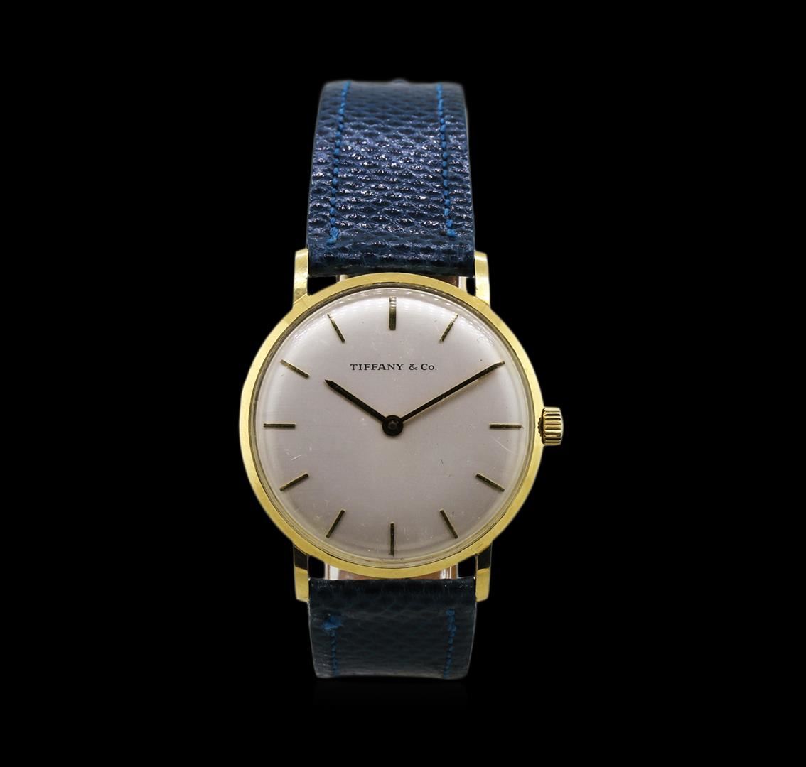 Case: 14KT yellow gold. Dial: Mother of pearl; gold tone hands; signed Tiffany & Co. Band: New lizard skin leather.
