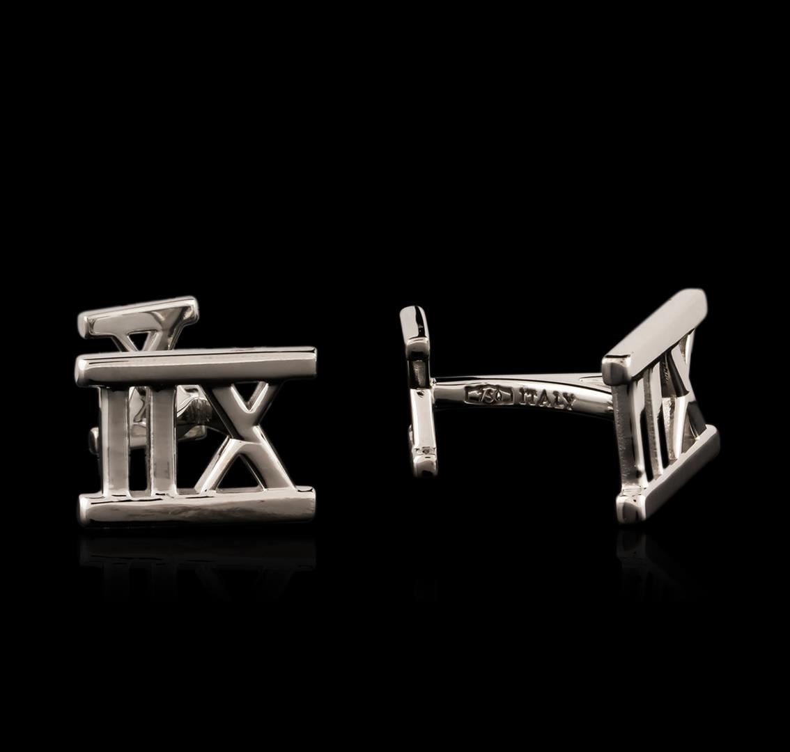 One pair electronically tested 18KT white gold gents cast cuff links. Each cuff link is from Tiffany & Co's Atlas Collection. Area measurements 22.0 x 13.0mm. Bright polish finish. Trademark is T & Co. Identified with markings of "750". Condition is good. Total Weight of Cuff Links 12.67 grams. AIG Appraised at $1,500.00.