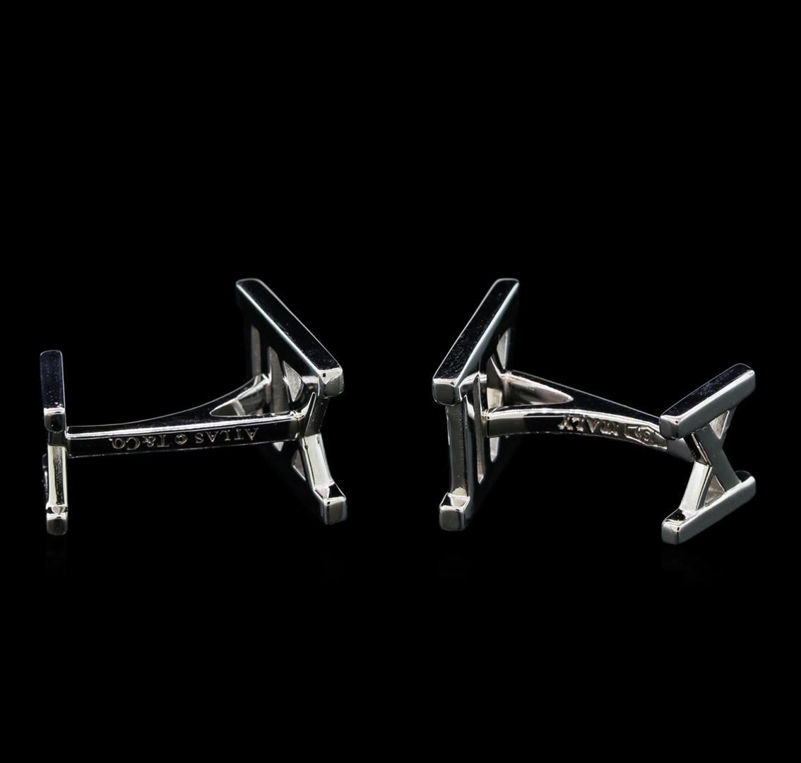 One pair electronically tested 18KT white gold gents cast cuff links. Each cuff link is from Tiffany & Co's Atlas Collection. Area measurements 22.0 x 13.0mm. Bright polish finish. Trademark is T & Co. Identified with markings of "750". Condition is good. Total Weight of Cuff Links 12.67 grams. AIG Appraised at $1,500.00.