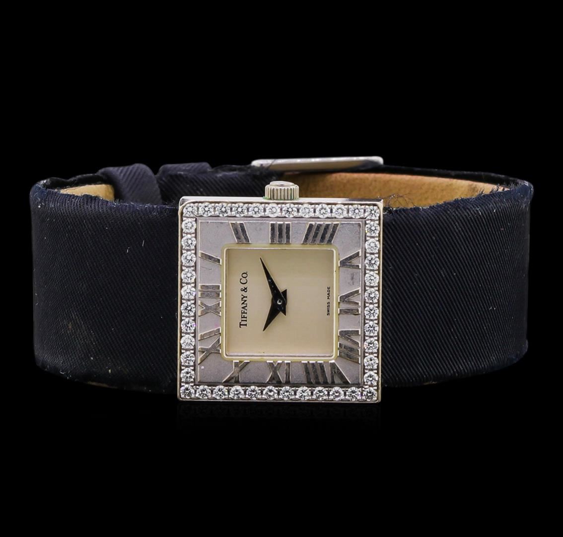One Tiffany & Co. ladies watch featuring: Case: 18KT white gold. Bezel: 18KT white gold set with diamonds; roman numerals. Dial: Silver color; silver tone hour and minute hands. Bracelet: Tiffany & Co. strap with buckle clasp.
