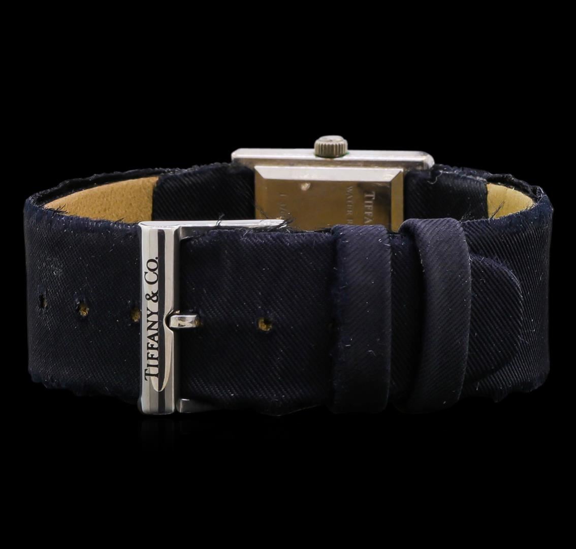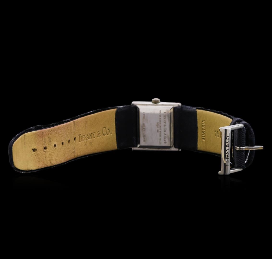 One Tiffany & Co. ladies watch featuring: Case: 18KT white gold. Bezel: 18KT white gold set with diamonds; roman numerals. Dial: Silver color; silver tone hour and minute hands. Bracelet: Tiffany & Co. strap with buckle clasp.