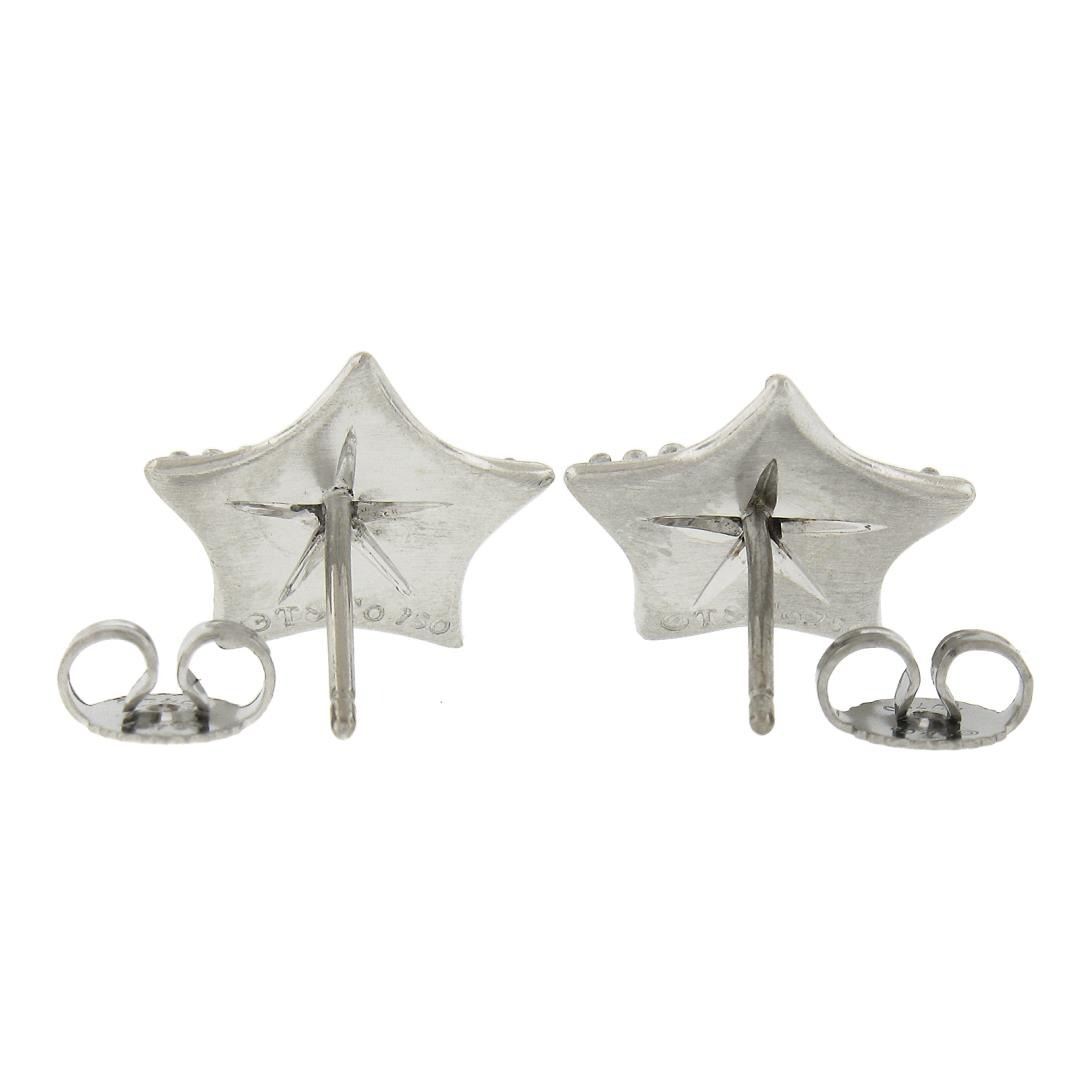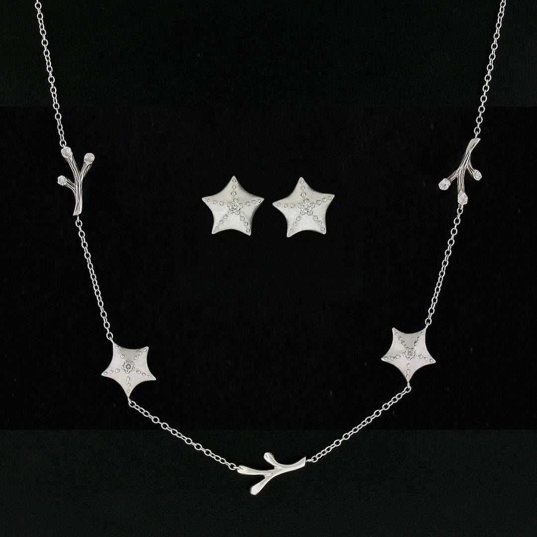 a solid 18k white gold necklace & earings set by Tiffany & co. featuring 4 round cut natural diamonds (F/G - VS1/VS2 ; 0.16ctw). It weighs a total of 11.23 grams, measures 13.8mm wide, and measures 18.5 inches in length. The earrings measure approximately 13.4mm and weigh a total of 6.10 grams.