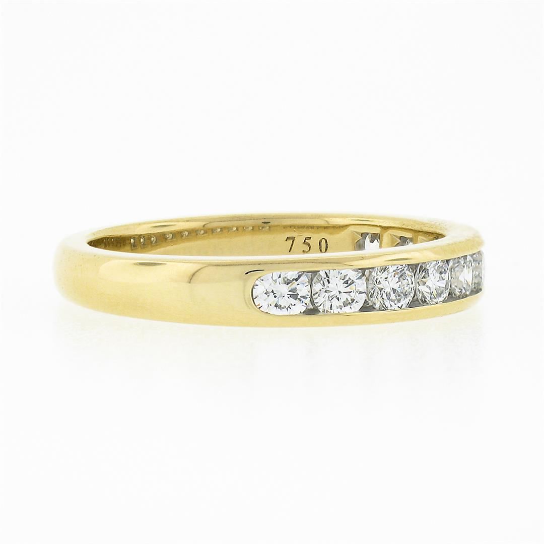 A solid 18k yellow gold band ring by Tiffany & co. with 10 round brilliant cut natural diamonds (E/F - VVS2/VS1 ; 1.0ctw). The ring is size 9.5, weighs a total of 6.16 grams, and measures 3.9mm wide.
