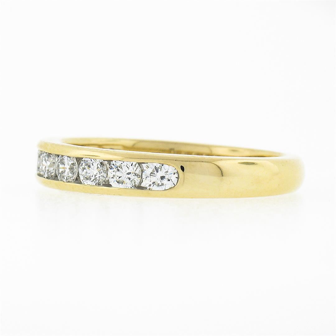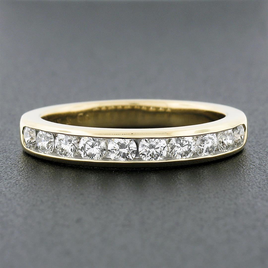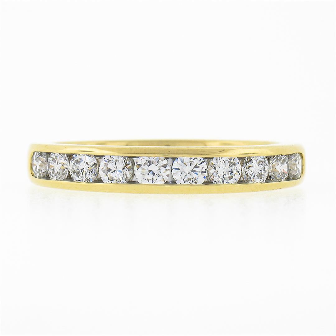 A solid 18k yellow gold band ring by Tiffany & co. with 10 round brilliant cut natural diamonds (E/F - VVS2/VS1 ; 1.0ctw). The ring is size 9.5, weighs a total of 6.16 grams, and measures 3.9mm wide.