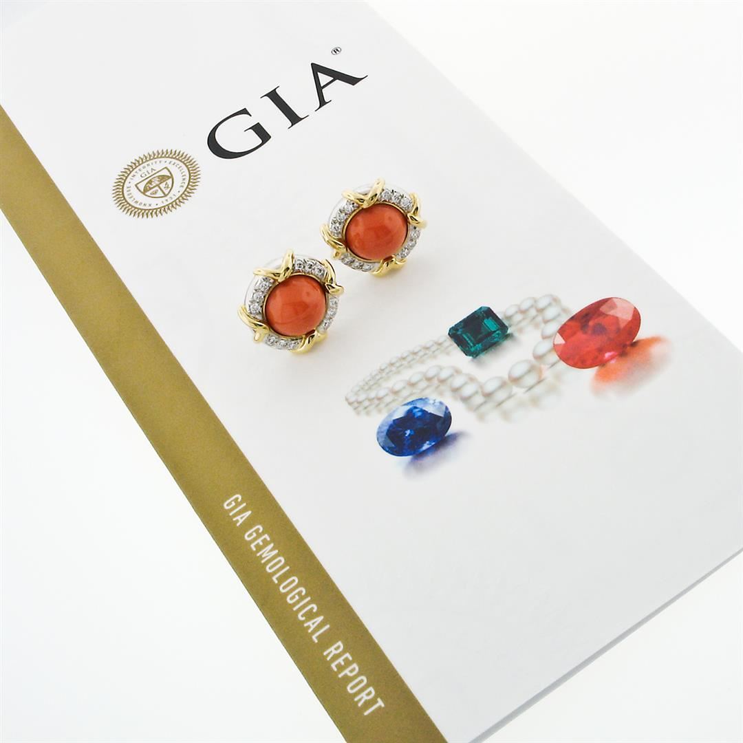 A pair of solid 18k yellow gold and platinum button earrings by Tiffany & Co. featuring 2 GIA certified round cabochon cut natural corals (11.60 - 11.62 x 5.45mm and 11.59 - 11.62 x 5.49mm) surrounded by 24 round brilliant cut natural diamonds (E/F - VVS1/VVS2; 0.75ctw). The earrings measure approximately 19.62x19.85mm and weigh a total of 20.72 grams. Comes with all original relevant certifications.