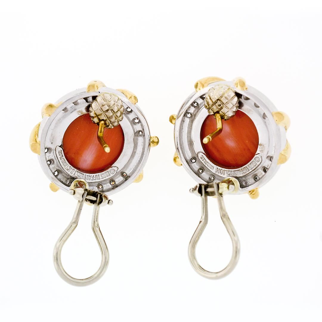 A pair of solid 18k yellow gold and platinum button earrings by Tiffany & Co. featuring 2 GIA certified round cabochon cut natural corals (11.60 - 11.62 x 5.45mm and 11.59 - 11.62 x 5.49mm) surrounded by 24 round brilliant cut natural diamonds (E/F - VVS1/VVS2; 0.75ctw). The earrings measure approximately 19.62x19.85mm and weigh a total of 20.72 grams. Comes with all original relevant certifications.