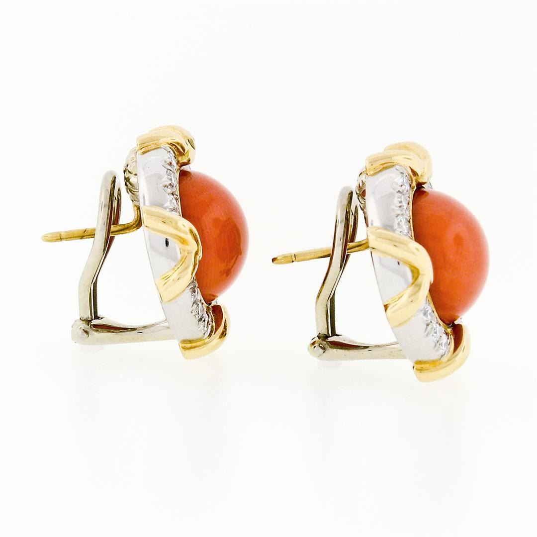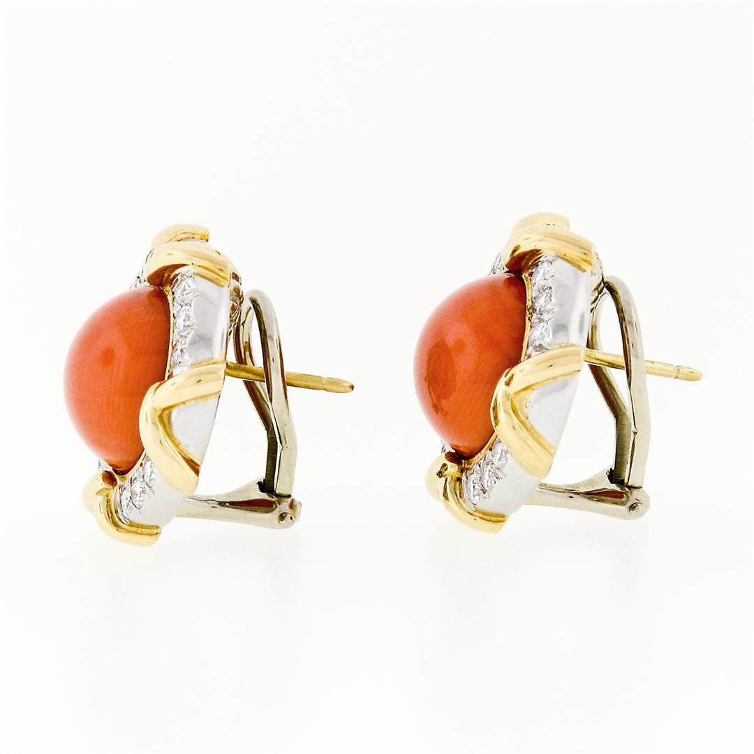 A pair of solid 18k yellow gold and platinum button earrings by Tiffany & Co. featuring 2 GIA certified round cabochon cut natural corals (11.60 - 11.62 x 5.45mm and 11.59 - 11.62 x 5.49mm) surrounded by 24 round brilliant cut natural diamonds (E/F - VVS1/VVS2; 0.75ctw). The earrings measure approximately 19.62x19.85mm and weigh a total of 20.72 grams. Comes with all original relevant certifications.