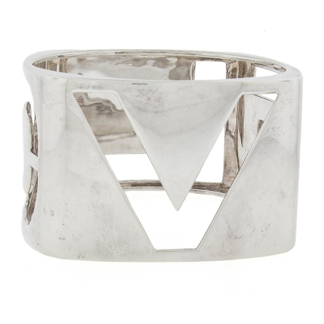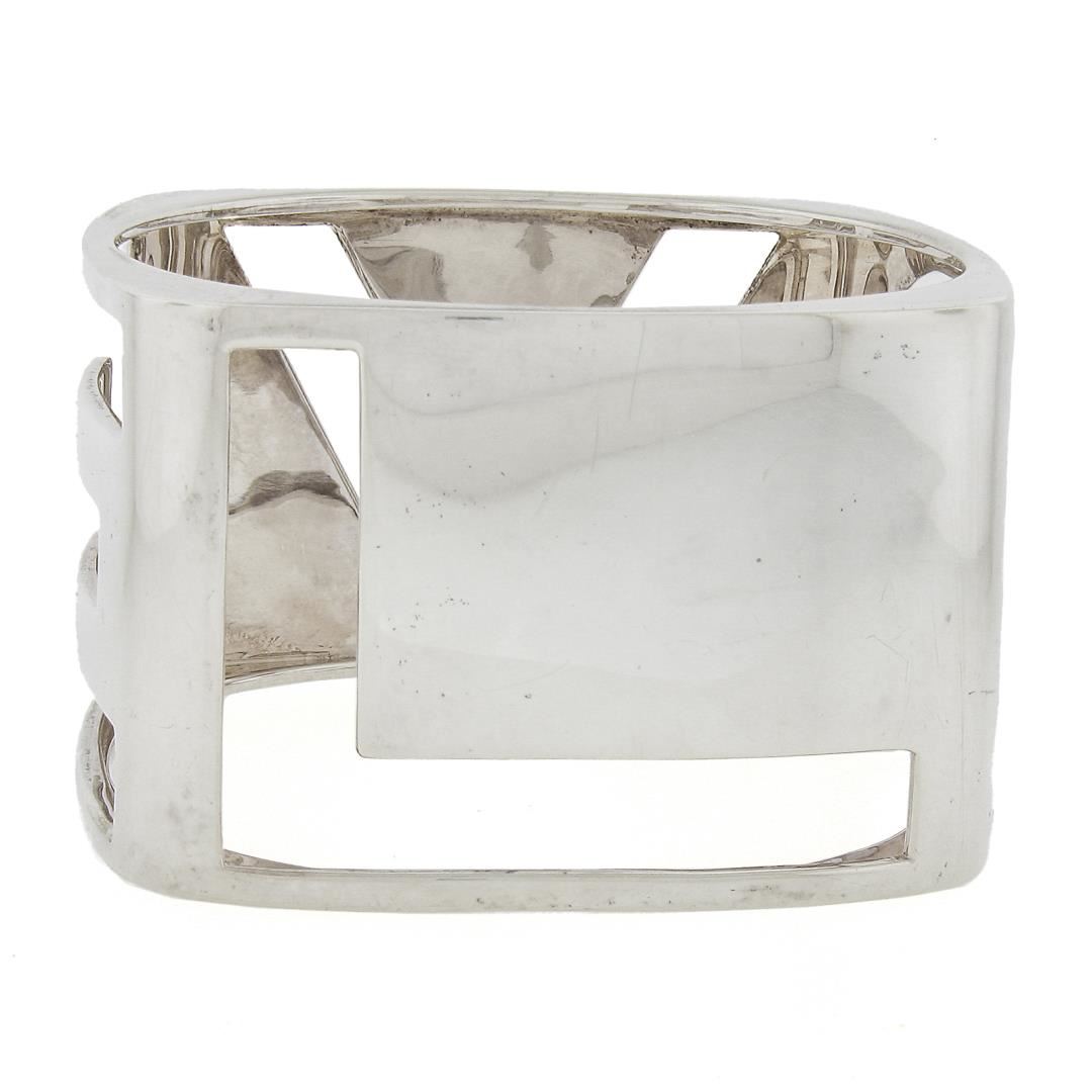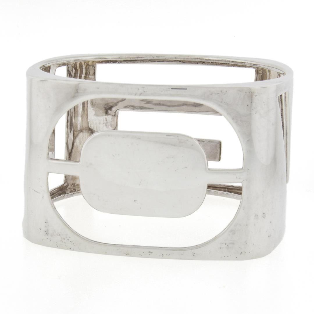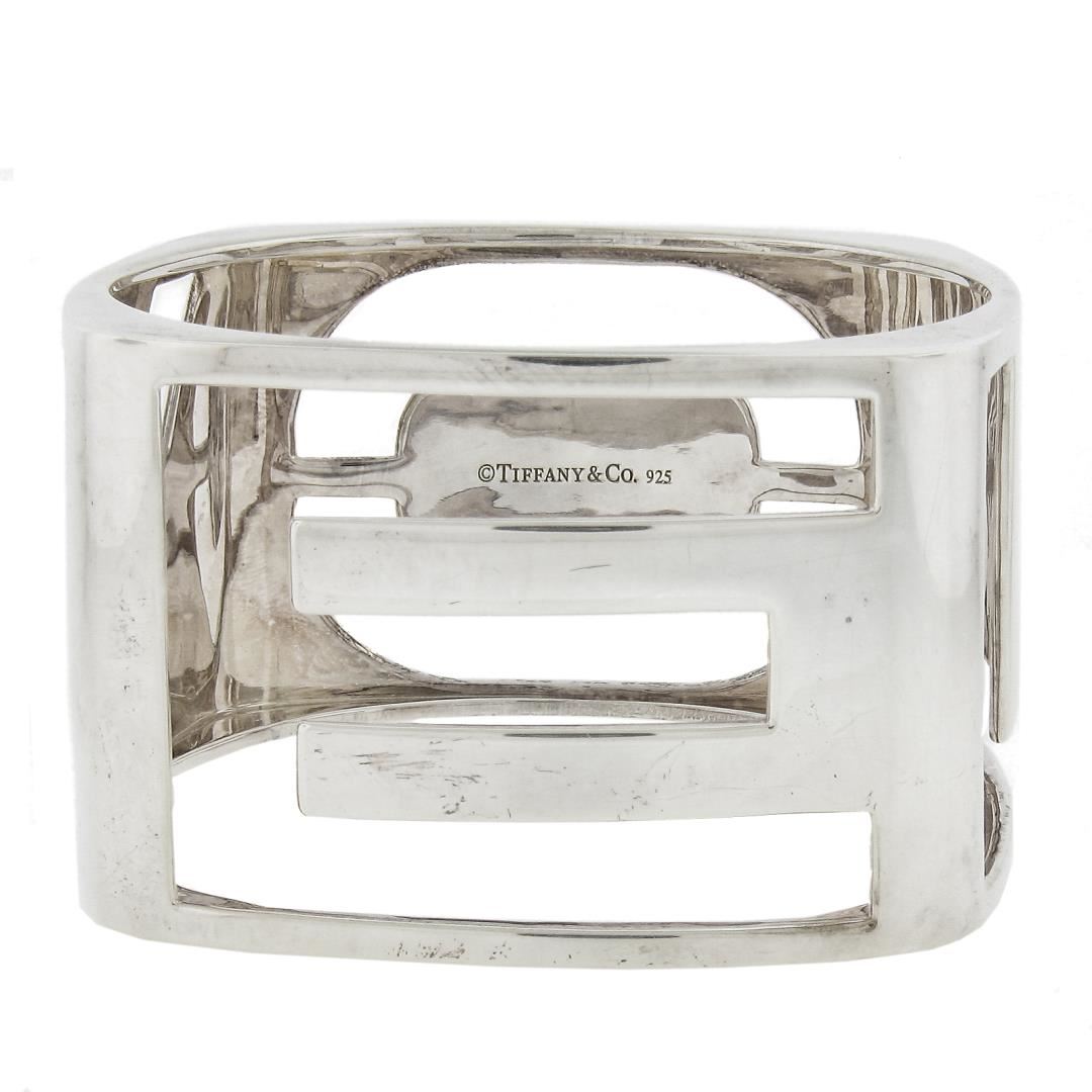 a solid silver wide slip on bangle bracelet by Tiffany & Co. It weighs a total of 111.92 grams, measures 41.3mm wide, and measures 8 inches in length.