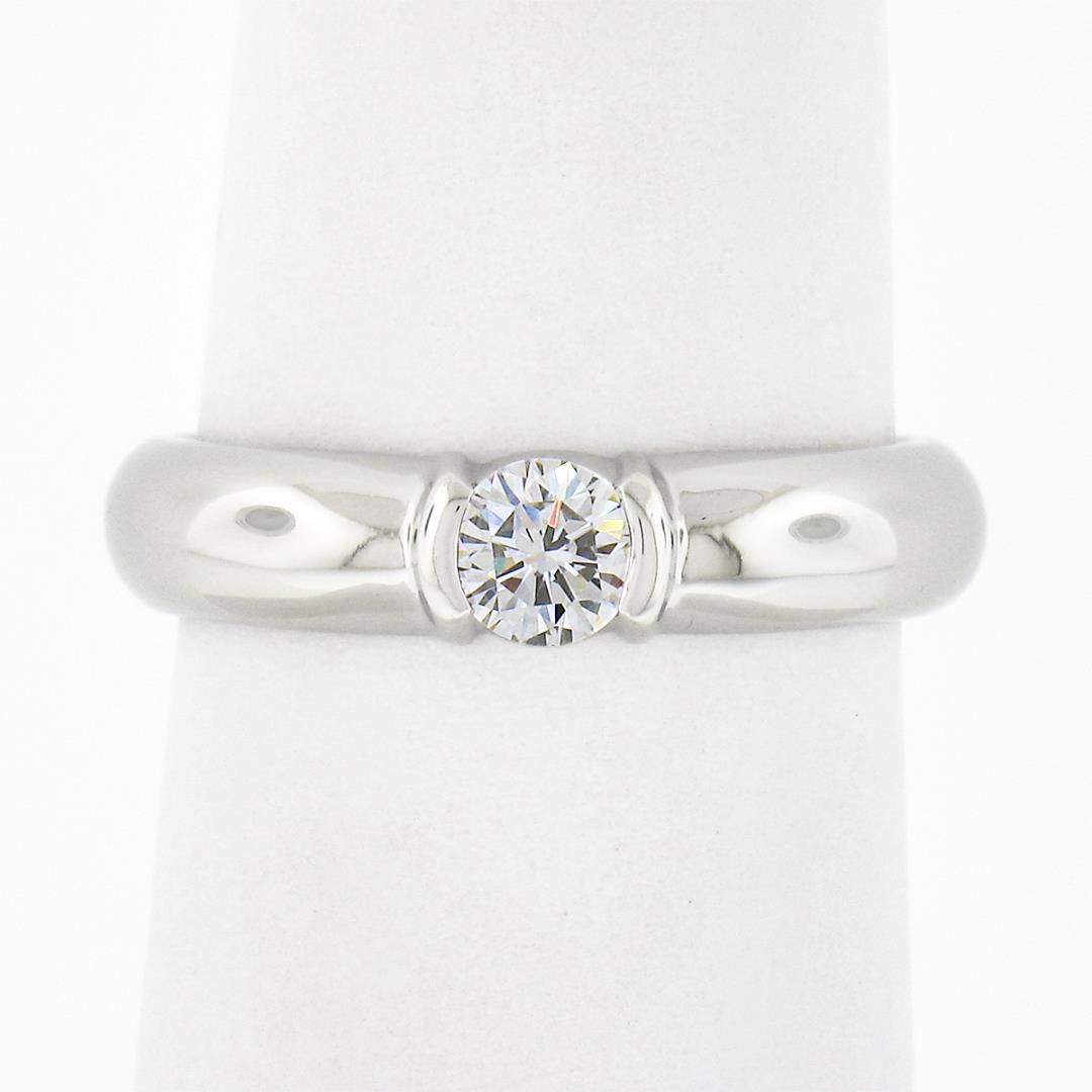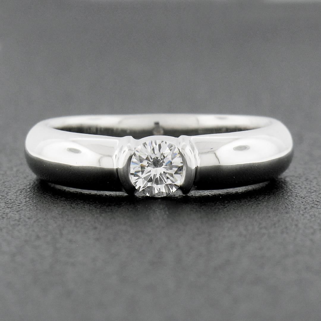 A solid platinum solitaire band ring by Tiffany & co. with 1 round cut natural diamond (F - VVS2 ; 0.26ct). The ring is size 5.5, weighs a total of 6.68 grams, and measures 4.3mm wide.