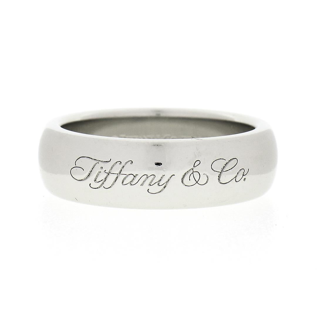 A solid platinum band ring by tiffany & co. The ring is size 5.5, weighs a total of 12.65 grams, and measures 5.85mm wide.