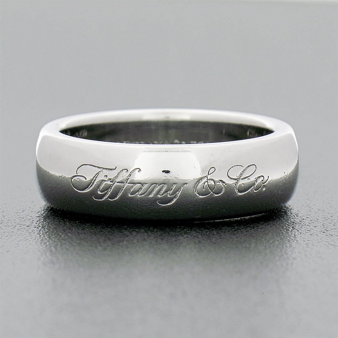 A solid platinum band ring by tiffany & co. The ring is size 5.5, weighs a total of 12.65 grams, and measures 5.85mm wide.