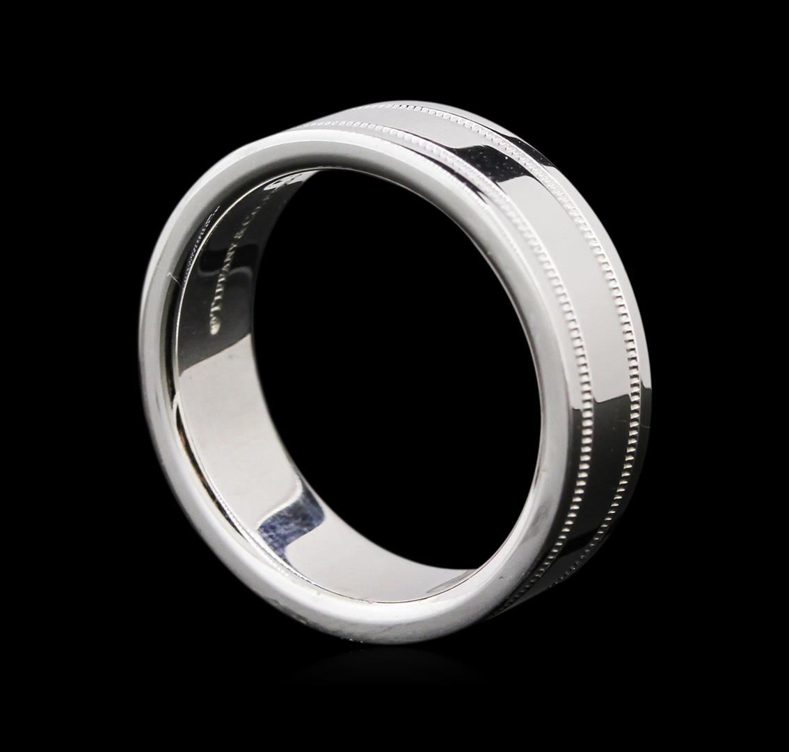 One electronically tested platinum lady's cast fashion ring with a bright polish with milgrain detailing finish. The featured lady's ring is a double milgrain wedding band from Tiffany and Co. with a shank measuring 6.00 millimeters wide. Trademark is Tiffany & Co. Identified with markings of "PT 950". Condition is new, good workmanship. Total Weight of Ring 13.40gm. GAS Appraised at $3,025.00.