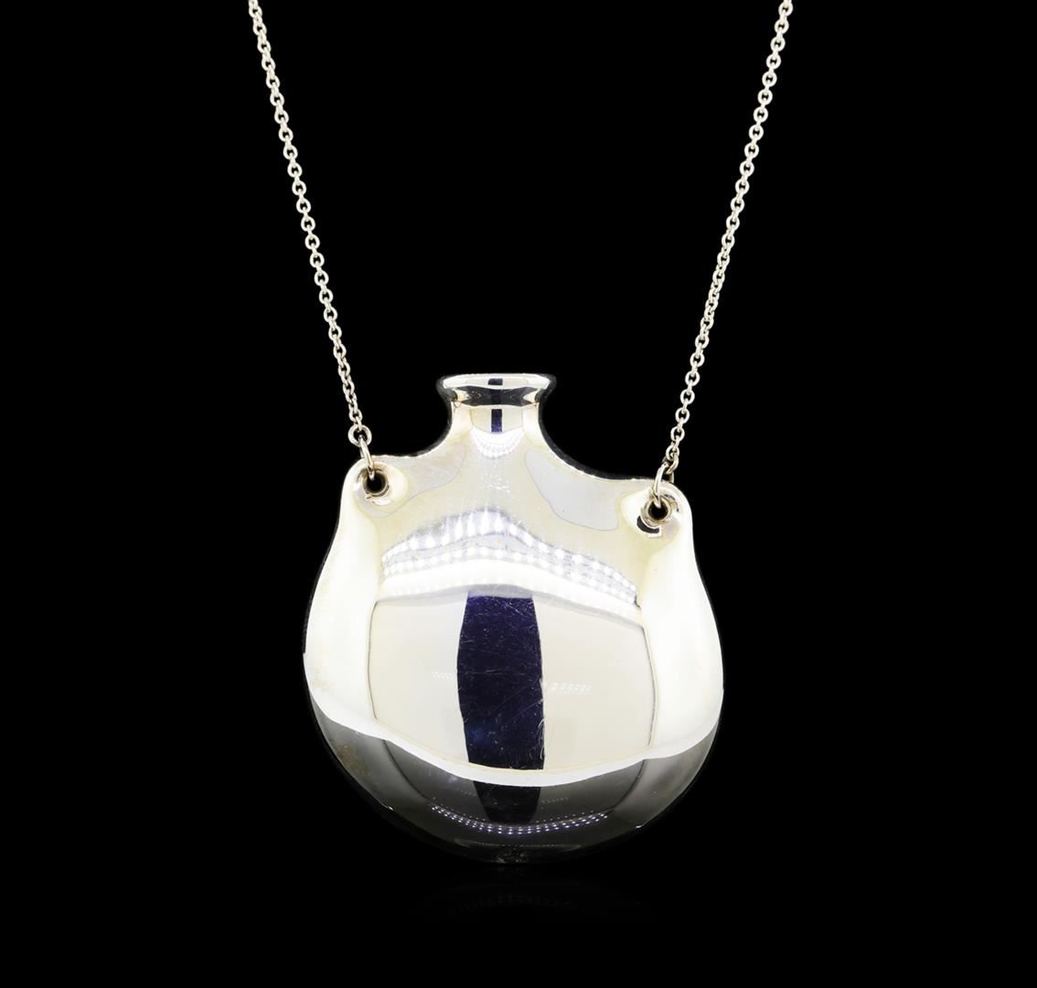 Light up your look with this Tiffany & Co. Sterling Silver Perfume Bottle Necklace. The perfume bottle measures 2" wide x 2.5" high. Stamped "Tiffany & Co. 925 Spain". This piece will certainly make a standout addition to your collection. The necklace measures 30" in length. Total Weight of Necklace: 53.5 grams. The necklace comes with original Tiffany & Co. jewelry bag and box.
