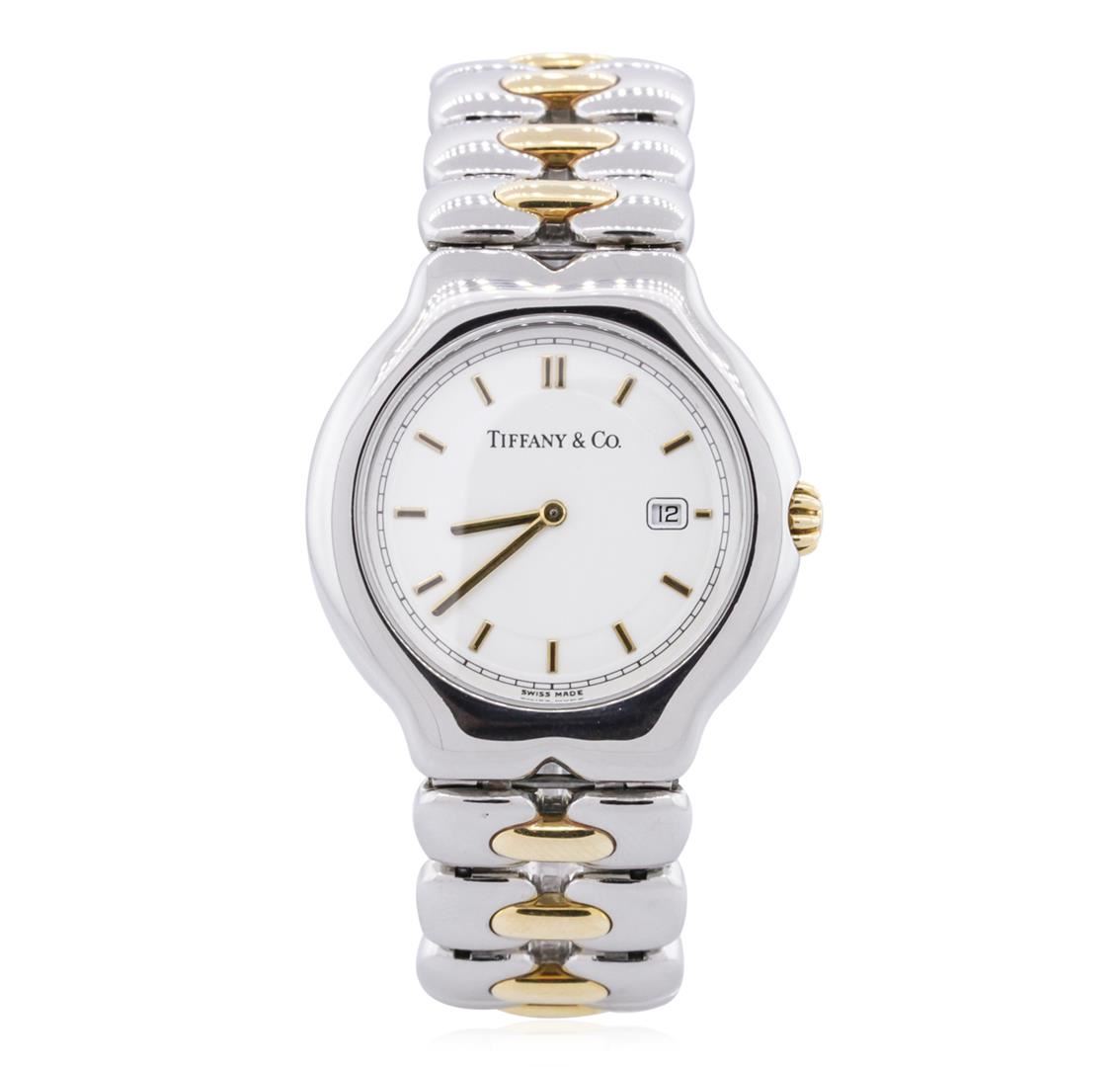 One, Tiffany & Company Tesoro wristwatch electronically tested, Stainless Steel Case: 34mm diameter, Case Back: engraved with the manufacturers name, and ID numbers, 18KT yellow gold Crown: scalloped, Crystal: synthetic sapphire lens, Dial: Ivory color, signed Tiffany & Co, with baton pointed hands and indices. Date Window: 3 o'clock position, Movement: Swiss quartz, Bracelet: stainless steel and 18KT yellow gold, Condition: G-4 Average. Seven inch length. Concealed deployment clasp. Total Weight of Watch 103.89 grams. AIG Appraised at $2,650.00.