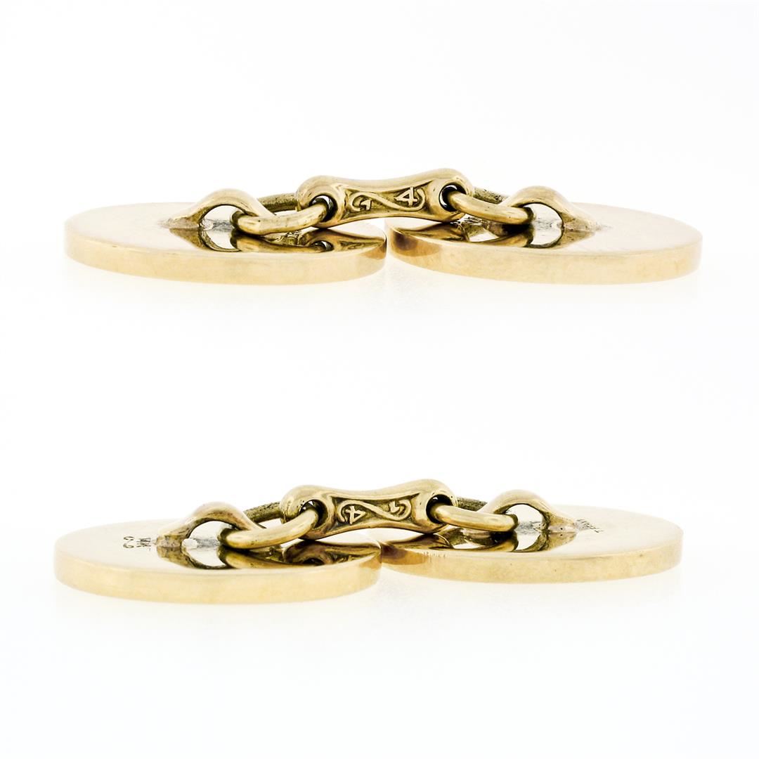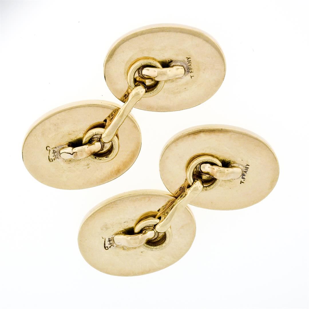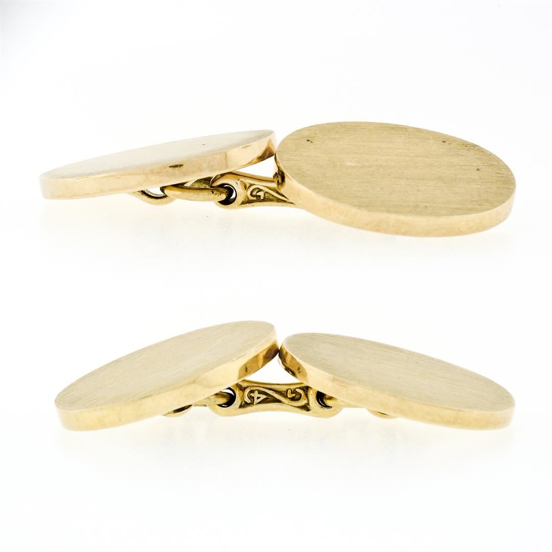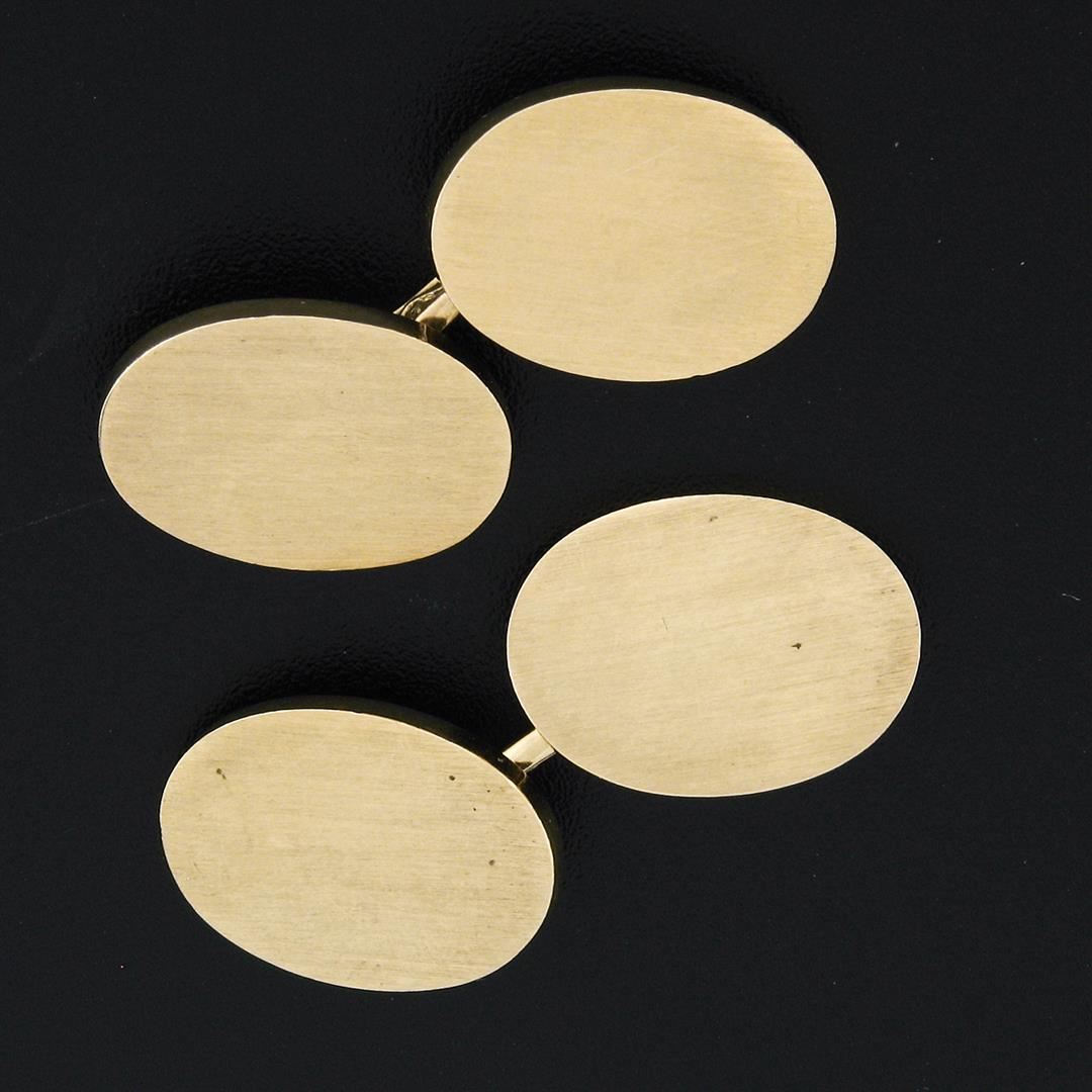 A vintage solid 14k yellow gold brushed engraveable cufflinks by Tiffany & Co. . These cuff links have a bar design with a clearance of 20.35mm, weigh a total of 23.26 grams, and the front panels measure 18.60x13.70mm.
