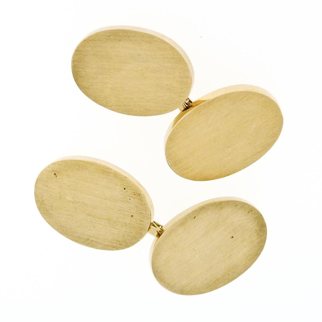 A vintage solid 14k yellow gold brushed engraveable cufflinks by Tiffany & Co. . These cuff links have a bar design with a clearance of 20.35mm, weigh a total of 23.26 grams, and the front panels measure 18.60x13.70mm.