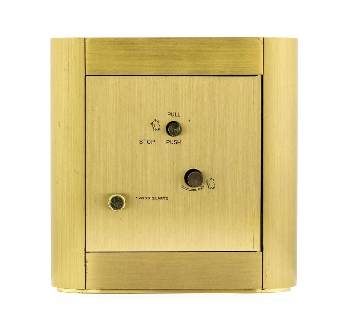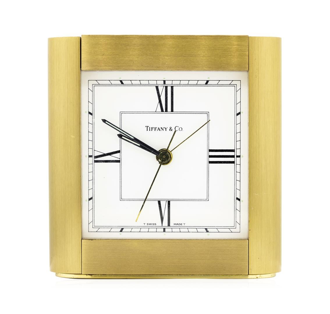 One Tiffany and Company Swiss-made brass desk clock. The clock measures approximately four inches tall and four inches wide.