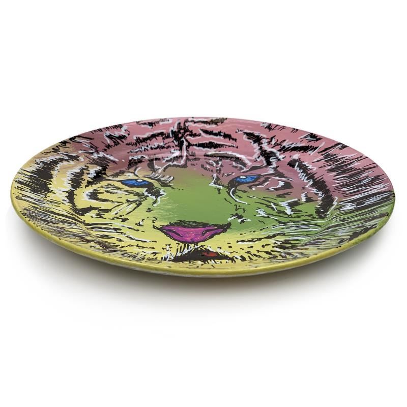 "Tiger" is a hand painted plate by Steve Kaufman (1960-2010). This piece is hand signed by the artist and includes a letter of authenticity. As is common with Kaufman's works, this piece may have perceived minor flaws, but is in overall good condition. Measures approximately 8" (diameter).
