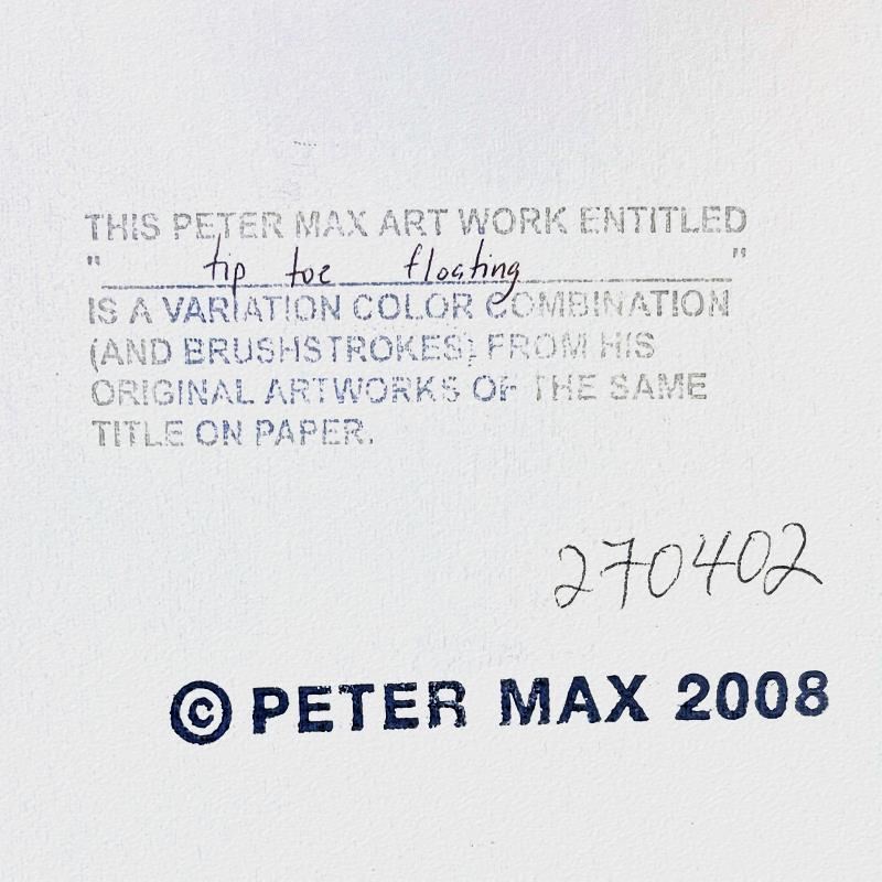 "Tip Toe Floating" is a hand signed one-of-a-kind acrylic mixed media on paper by Peter Max. The piece comes custom framed with a backside cutout to display Peter Max Studio registration number 270402 certifying authenticity. Measures approximately 30" x 26" (frame), 17" x 13" (image). This item requires special handling and may have a longer than usual turnaround.