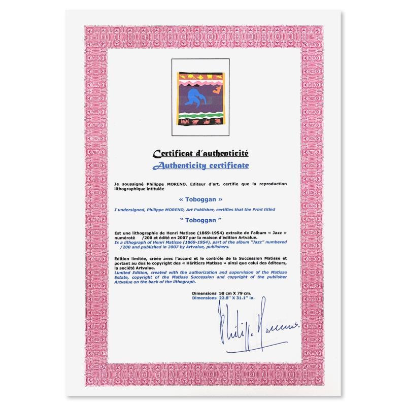 "Toboggan" is a limited edition lithograph by Henri Matisse (1869-1954). This piece comes from an edition of 200 authorized by the Matisse Estate; the edition number is not on the piece itself but on the certificate. This piece comes custom framed. Includes Certificate of Authenticity. Measures approx. 29" x 37" (frame), 23" x 31" (image). This item requires special handling and may have a longer than usual turnaround.