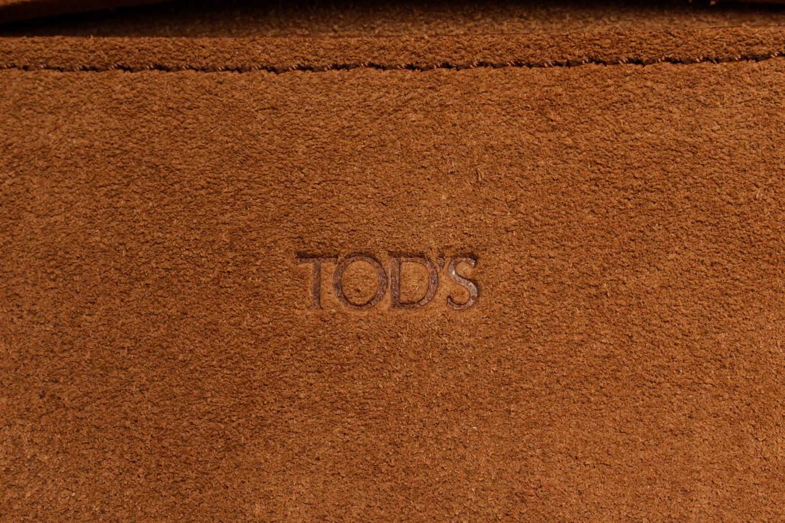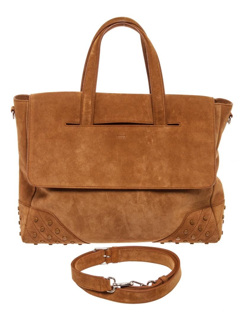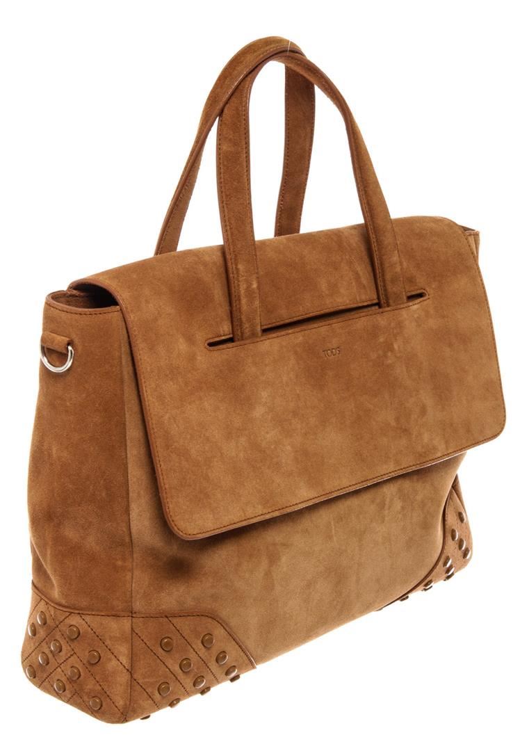 Crafted in brown suede, the Tod's Envelope Convertible Bag features dual-flat suede handles, detachable strap, stamped Tod's logo on the front flap, iconic rubber pebbles at the bottom and gunmetal-tone hardware accents. It opens to a black nylon-lined in