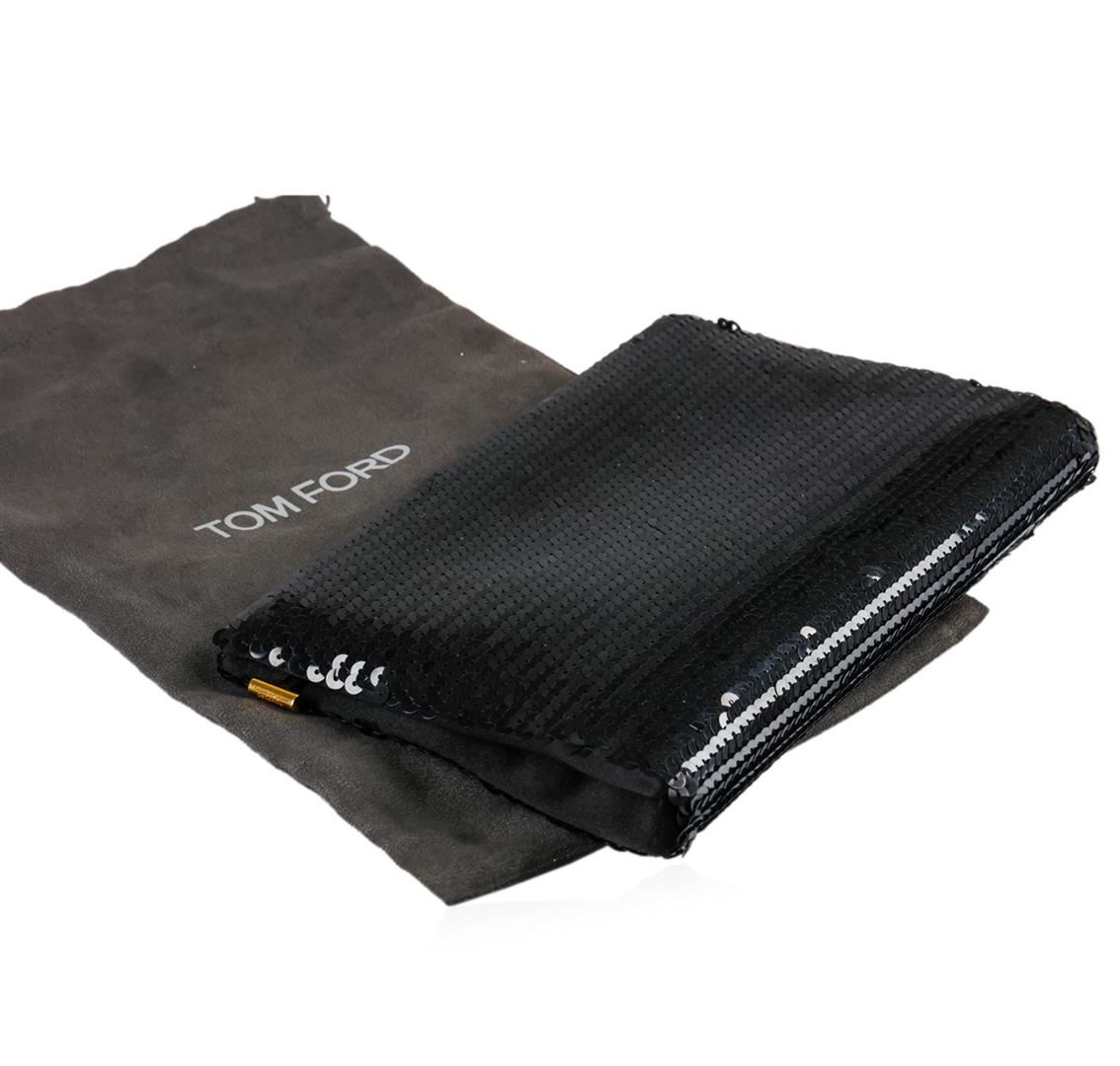 An enviable evening clutch crafted from stunning black sequins is destined to be every bit as addictive as its delectable namesake. The streamlined silhouette gives way to a zippered petite compartment, making organization effortless, and features gold accents that perfectly complement the classic look. Condition is brand new with tag and dust bag, and measures 10.5" x 7" x 1".