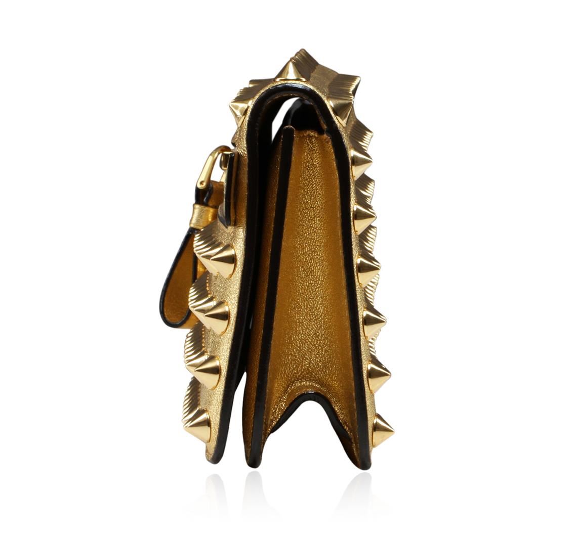 One Tom Ford Metallic Studded Gold Zip Clutch. This clutch features the signature golden hardware, full-flap front with magnetic-snap closure, front zip pocket at flap, and interior zip pocket. Estimated retail value $2,940.00.