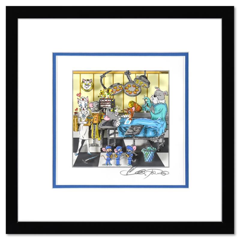 "Tom and Jerry's Surgical CATrosphe" is a 3D limited edition silk screen construct on paper by Charles Fazzino, DX numbered 92/100 and hand signed by the artist. This piece comes custom framed. Includes Certificate of Authenticity. Measures approximately 14" x 14" (frame), 6" x 6" (image).