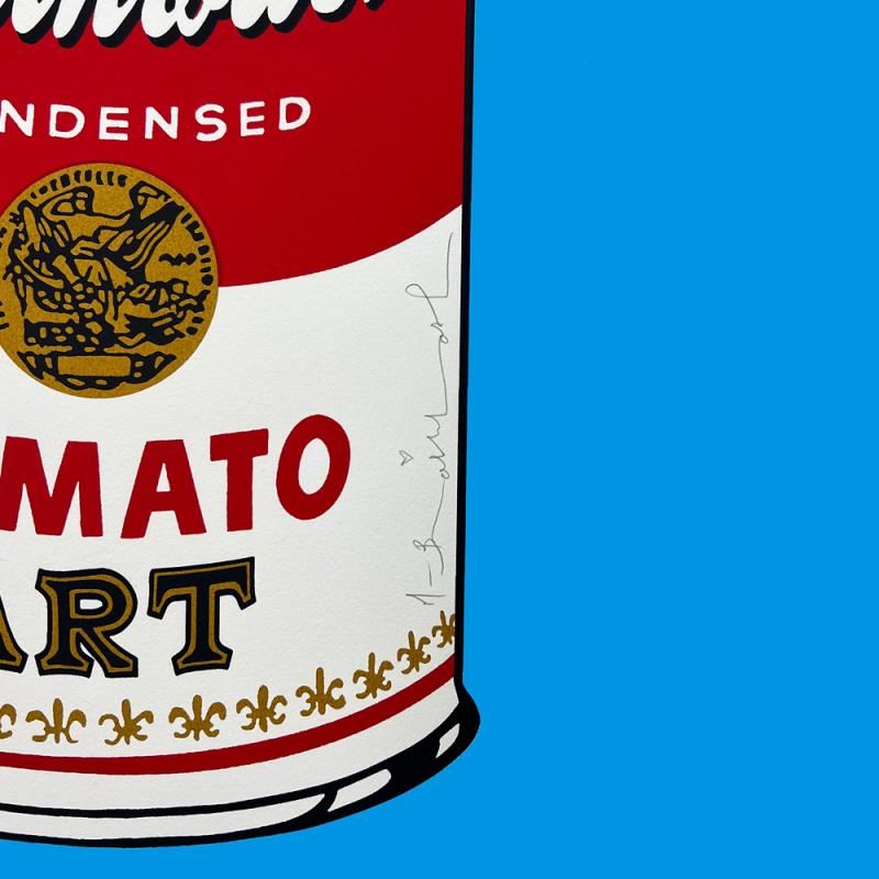"Tomato Pop (Blue)" is a limited edition uniquely hand-finished silk screen print on paper by Mr Brainwash. The piece is hand signed and thumb-printed by the artist. The piece comes custom framed and with a Certificate of Authenticity. Measures approximately 42" x 34" (framed), 30" x 22" (image).