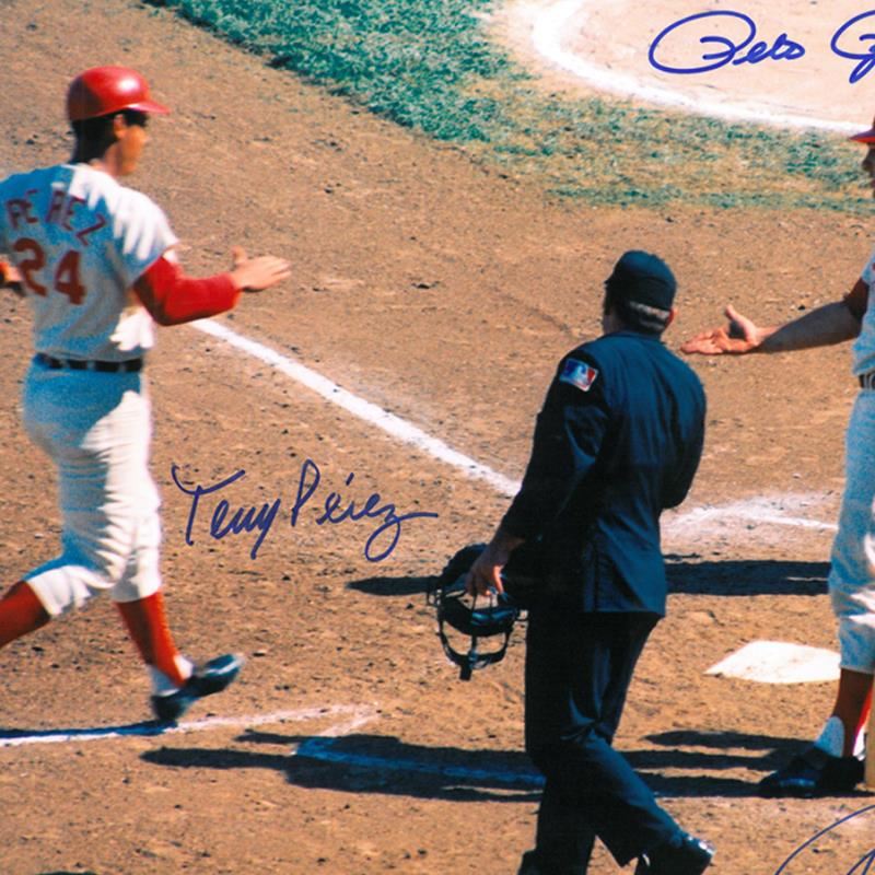 "Tony Crossing the Plate" is an archival photograph featuring Tony Perez crossing the plate and being congratulated by teammates Pete Rose and Johnny Bench was taken by photographer Sarge Marsh circa 1968. Perez was a part of the famous "Great Eight" starting line-up of the Big Red Machine. This photo has been signed by Tony Perez, Pete Rose and Johnny Bench. This piece comes framed. Measures approx. 26" x 22" (frame), 20" x 16" (image).