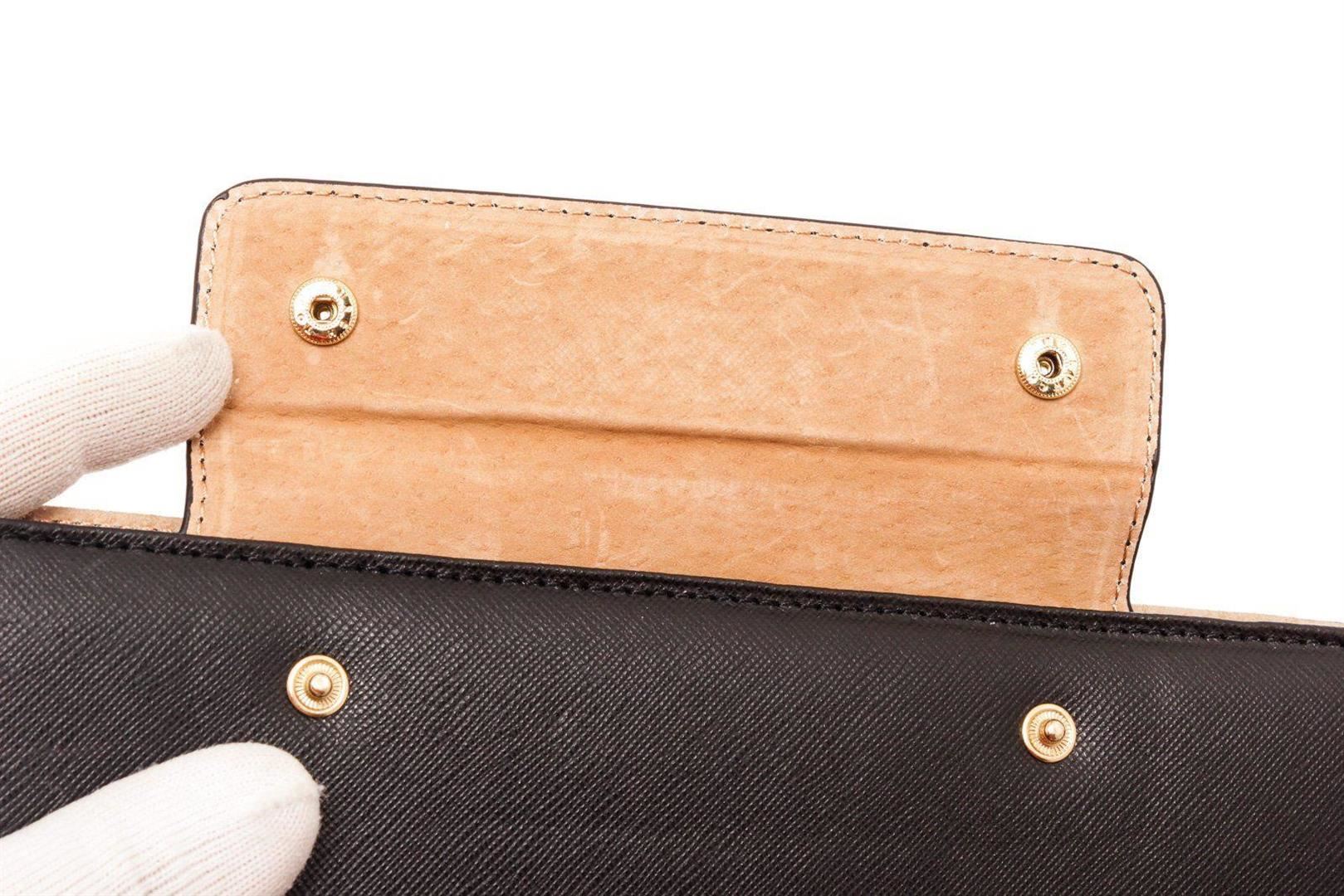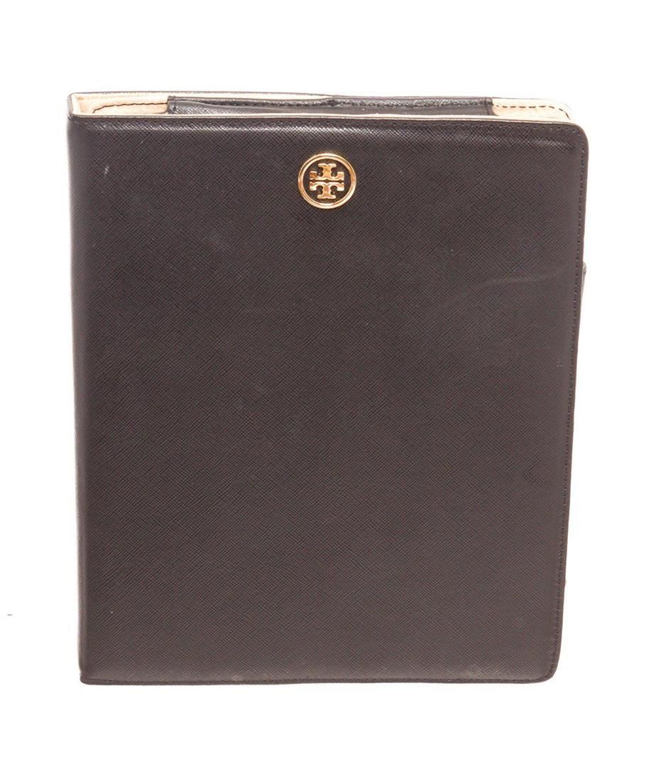 Tory Burch black leather Robinson Flip tablet case with gold-tone hardware, logo placard at front, tan suede interior lining with Ipad pocket holder and overall snap closure. Measurements: Length: 8 in / 20 cm Width: 1 in / 3 cm 10 in / 25 cm Condition: Pre-Owned Good overall, please see photographs for detail.